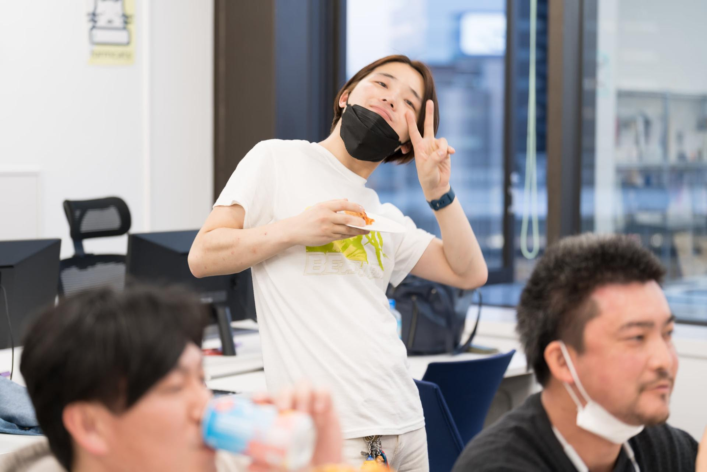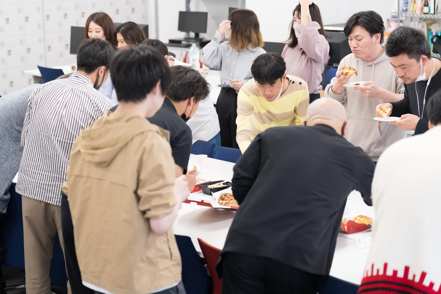 合宿では各チームの発表後に宿舎で大宴会を行うのですが、今回はオフィスでピザを囲みました。
