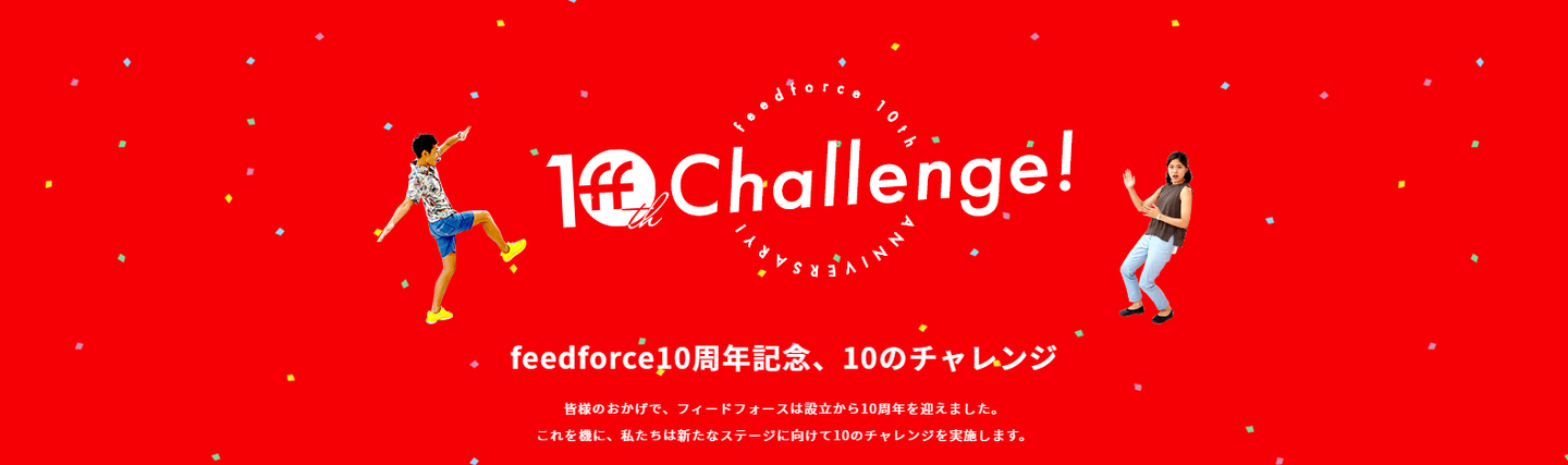 本日、フィードフォース設立10周年を記念した10周年記念特設ページが公開となりました!この10周年記念特設ページでは、10周年にちなんだ”10のチャレンジ”を随時、公開しております!