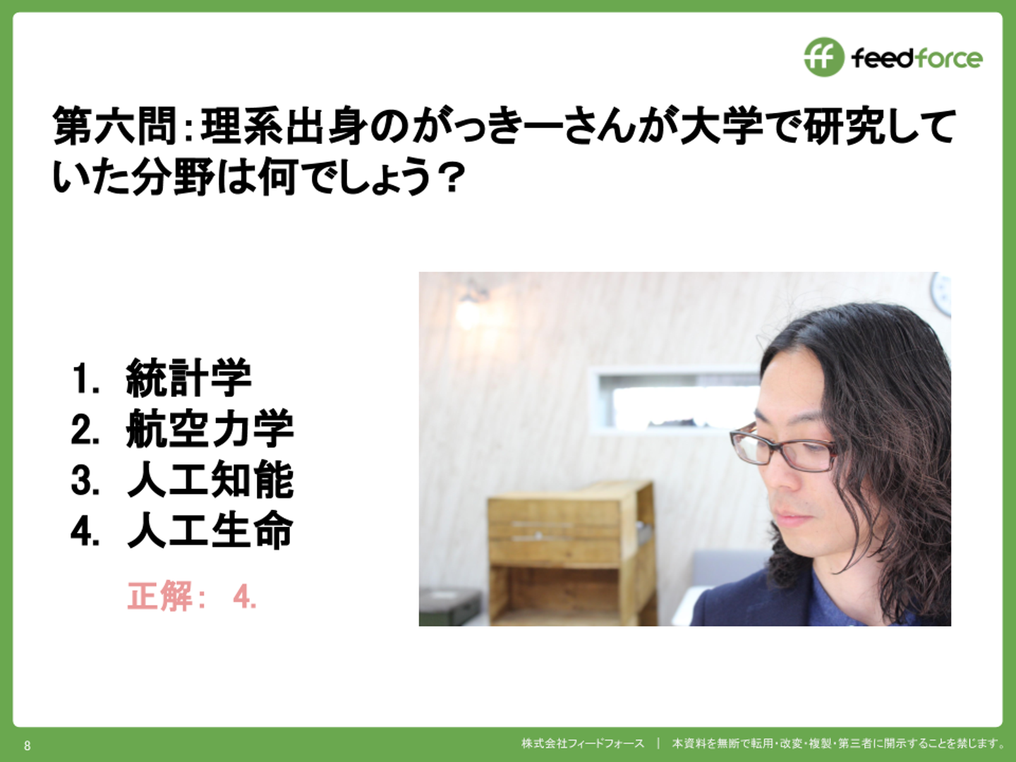 例えば「急激に増えている気がするフィードフォースの男性社員の人数はいくつでしょう?」や「趣味が登山の中村さんが登山を始めた動機として正しいものはどれでしょう?」「理系出身のがっきーさんが大学で研究していた分野は何でしょう」と言った会社の知識を問う問題や、普段の会話や過去の記事から推測できるものもあれば、「初恋のお相手はずばり、どなたでしょう?」といったマニアックな問題まで様々な問題が出題されました!