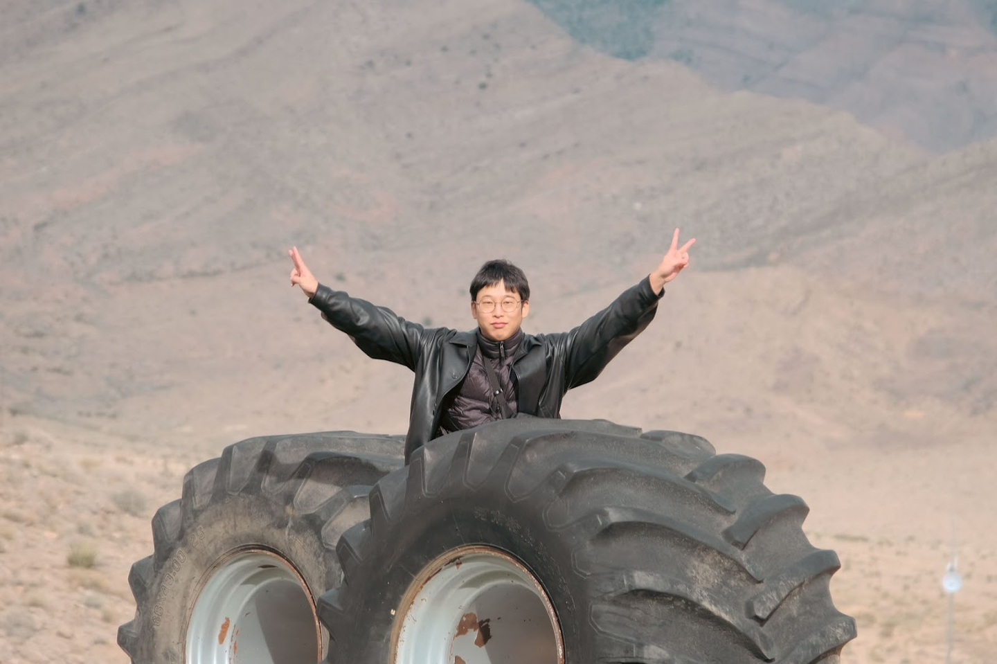 (射撃場で見つけた大きなタイヤと記念撮影)