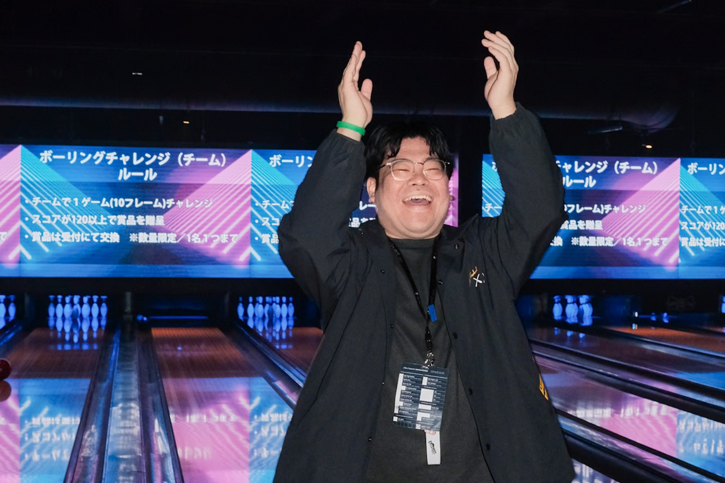 (日本人参加者を集めたパーティー、Japan Nightのボーリングチャレンジでストライクを決めて)