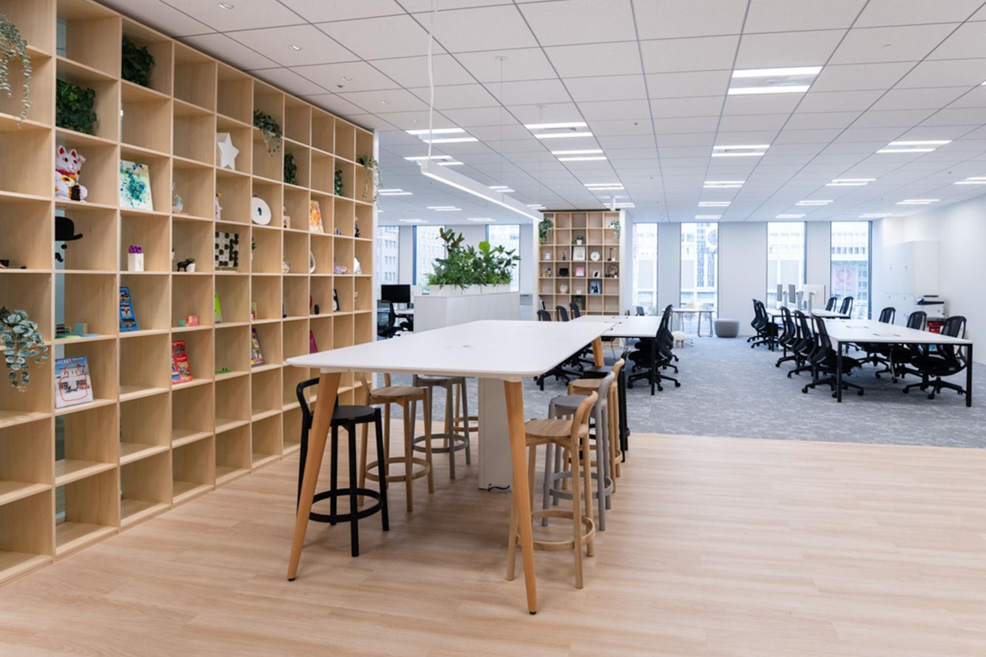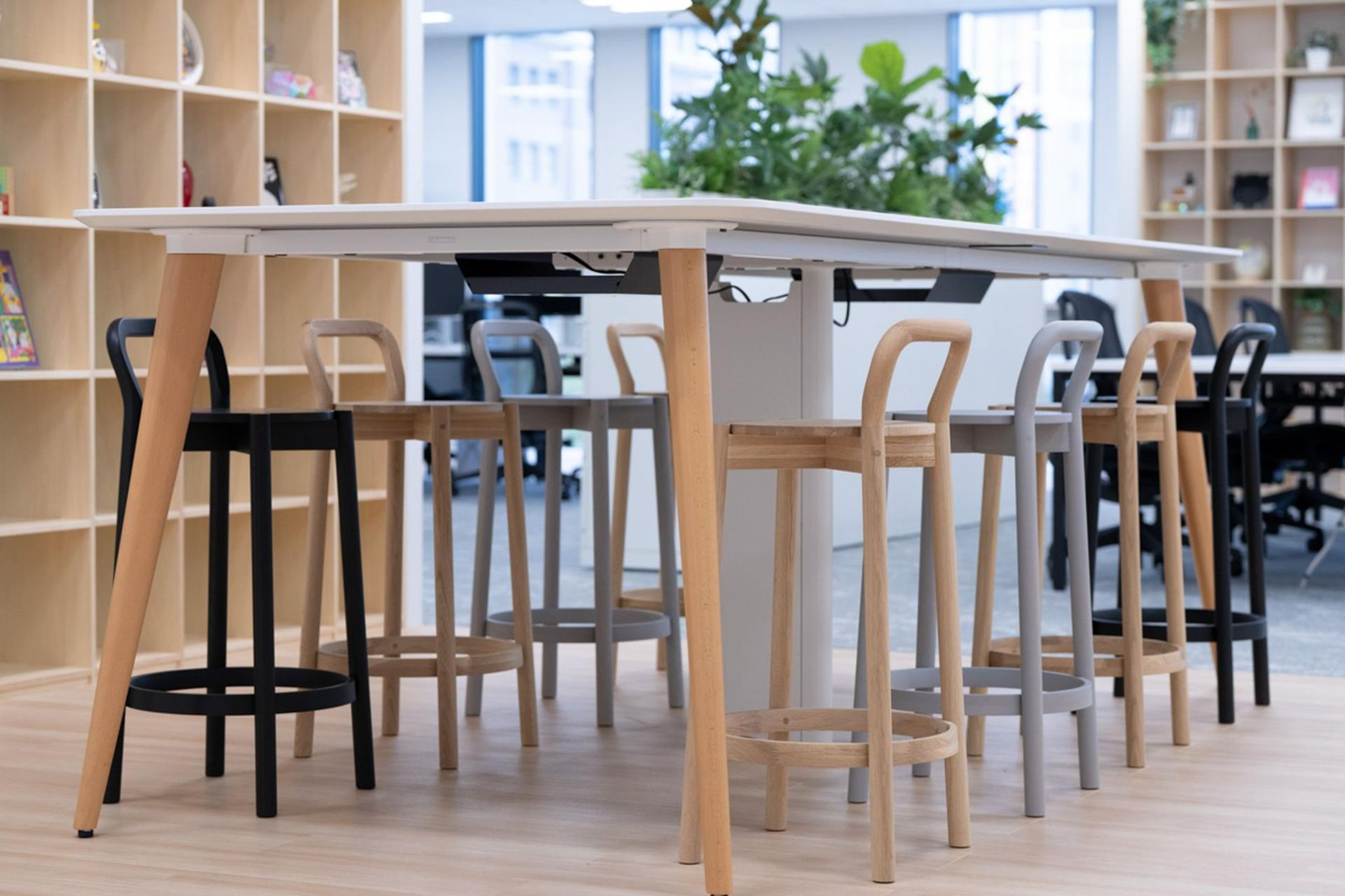 開設当初より使用していた大きな本棚は、増床した新しいオフィスの共有スペースへ移しました。その本棚の前には、大きなハイテーブルと8脚のハイチェアを設置しています。ハイチェアの色はあえて1色に統一せず、黒・グレー・ベージュの3色をバランス良く配置。この空間に、これまで以上に色んな個性やアイデアが集まり、多様性に満ちたフェンリルになっていくことを期待して選びました。
