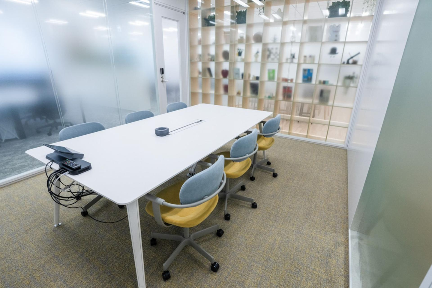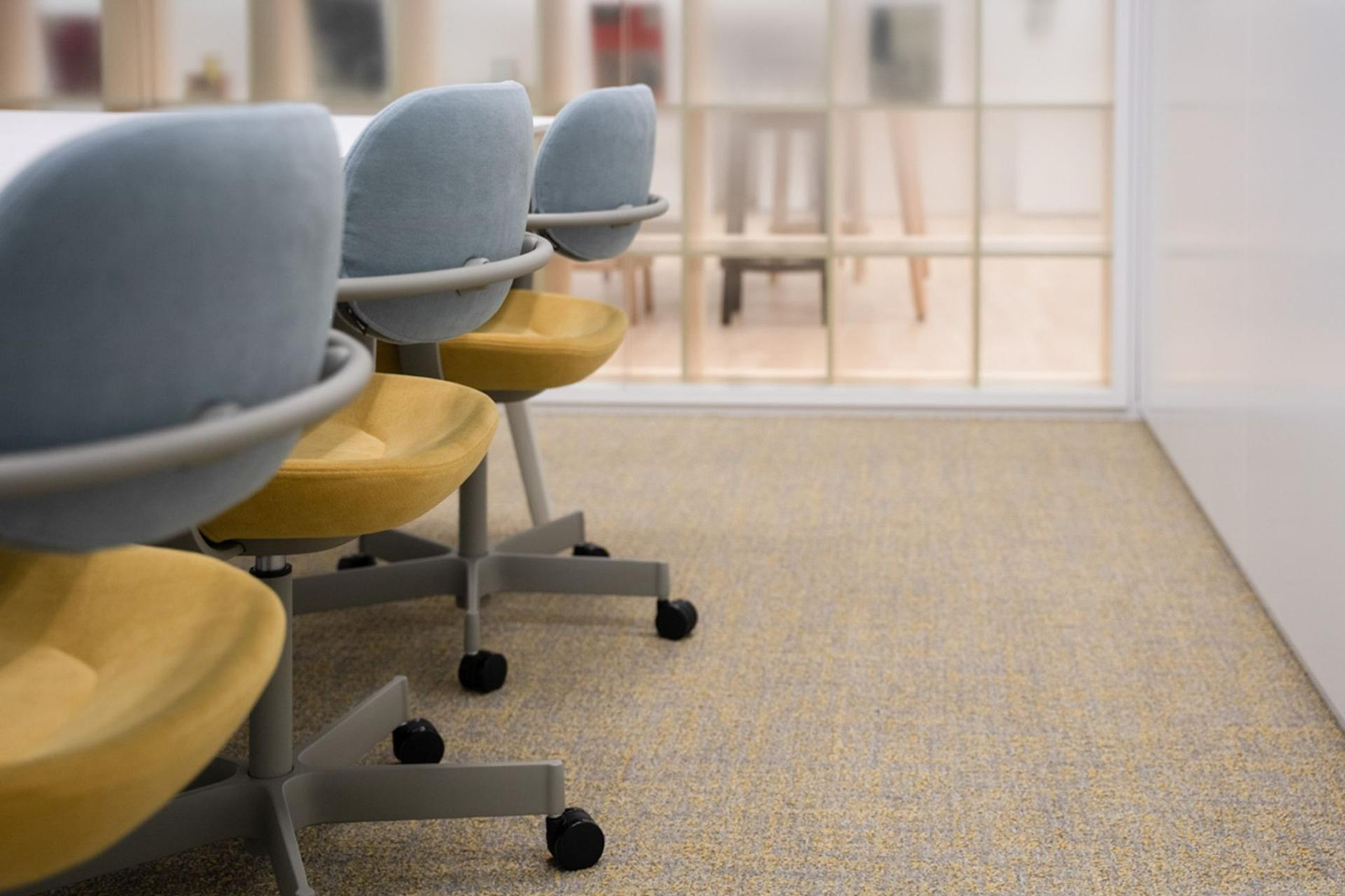 椅子や床のトーンを揃え、広がりを感じる色使いを採用。会議室のカラー(イエロー・グレー)を、ガラス越しに見える執務室の床の色ともリンクさせ、空間全体に一体感を持たせました。