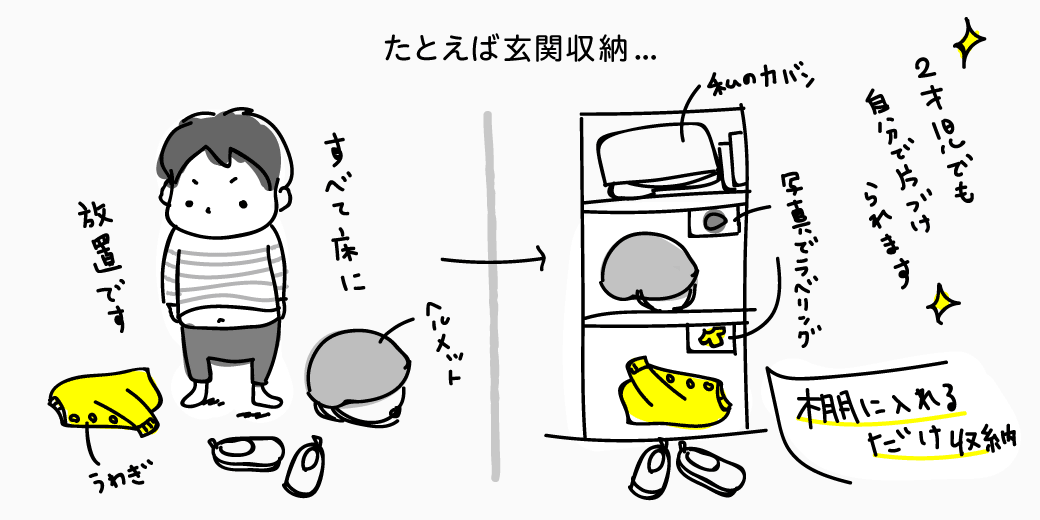 たとえば玄関収納に、子供専用のロッカーをつくりました 。棚にポイポイ入れるだけの簡単収納です。それだけで、玄関の床に放置していた上着やヘルメットを、子どもが自ら片付けるようになりました。