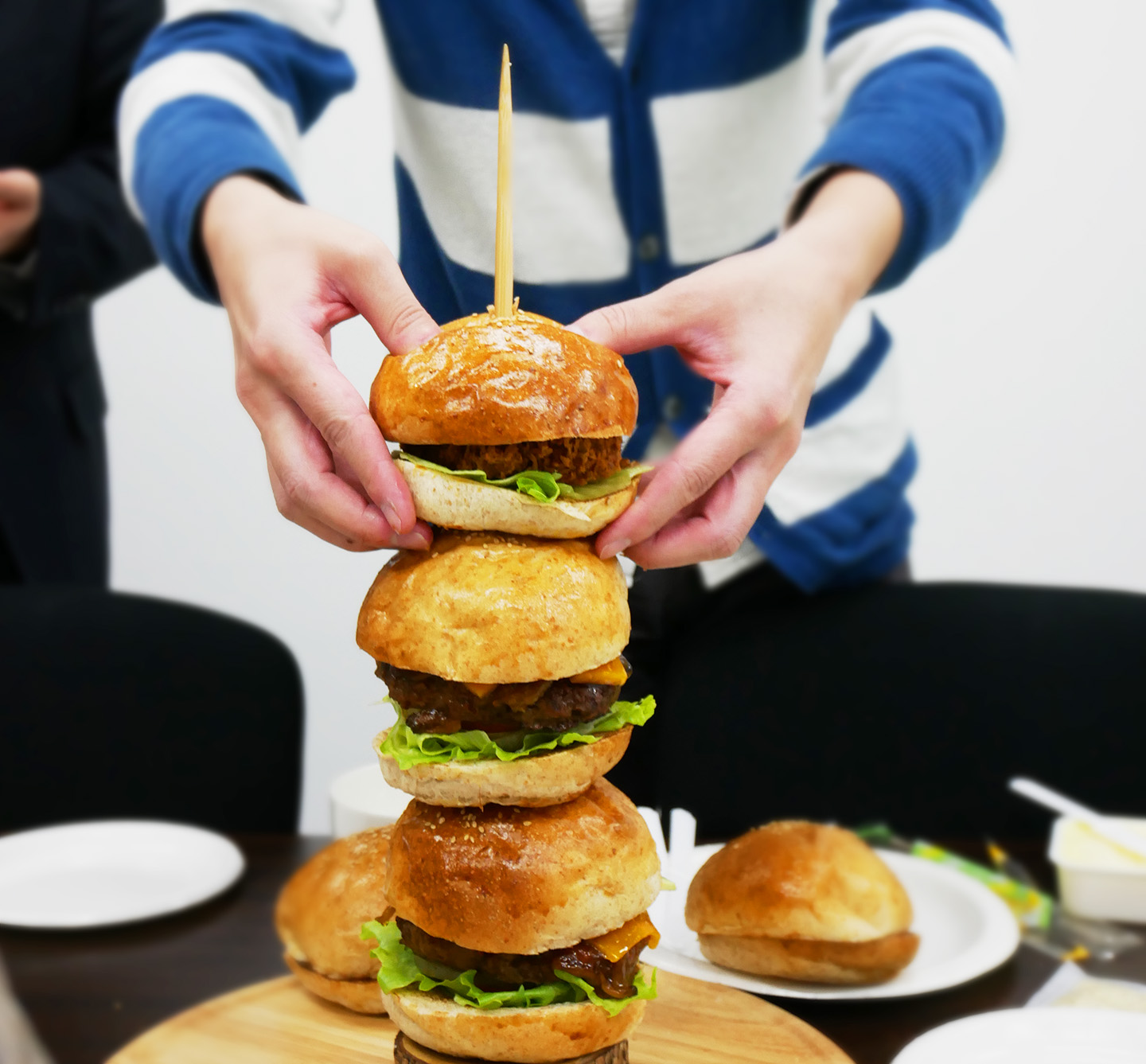 ただハンバーガーをつくるだけではなくタワーにするなど、いろいろなことにこだわるのが名古屋支社の懇親会スタイル!バンズはなんとスタッフの手作りで、こだわりポイントの一つなんです。