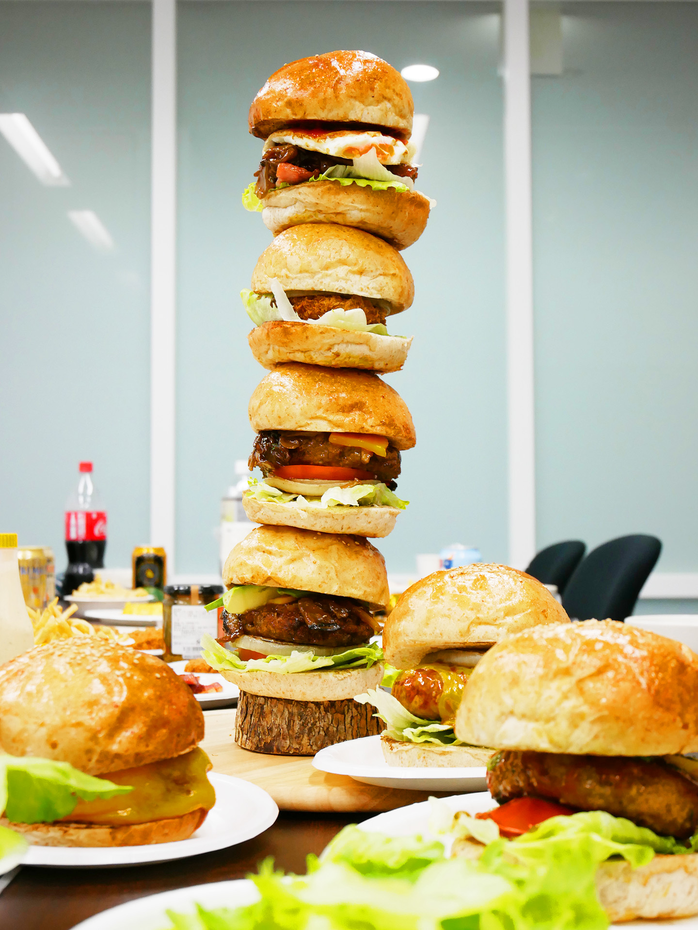 そして、今回の懇親会はスタッフ7名+普段は大阪本社にいる部長も参加し、ハンバーガータワーをつくりました。