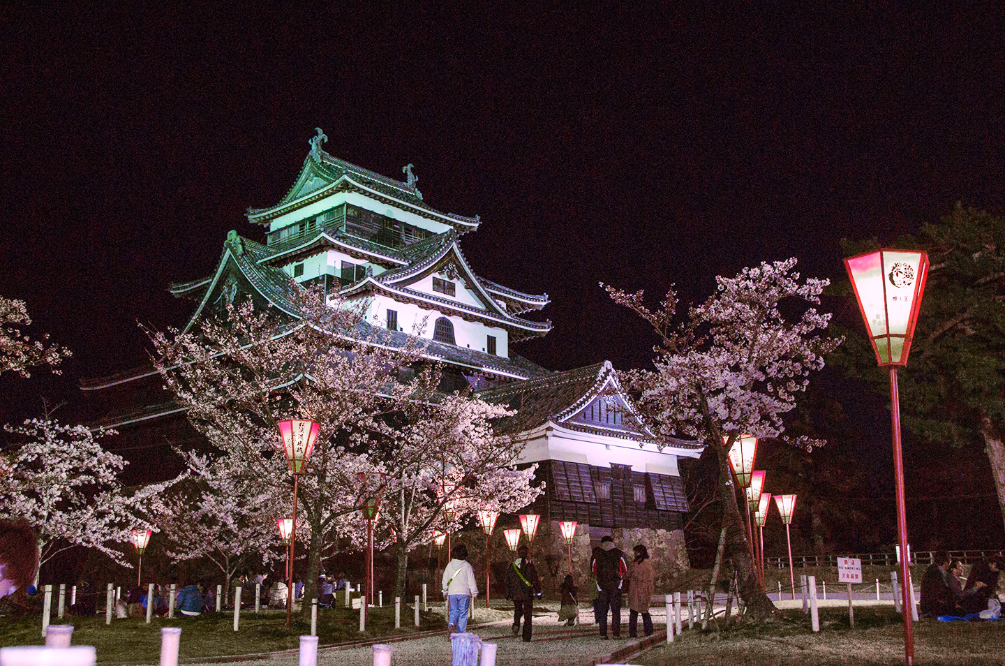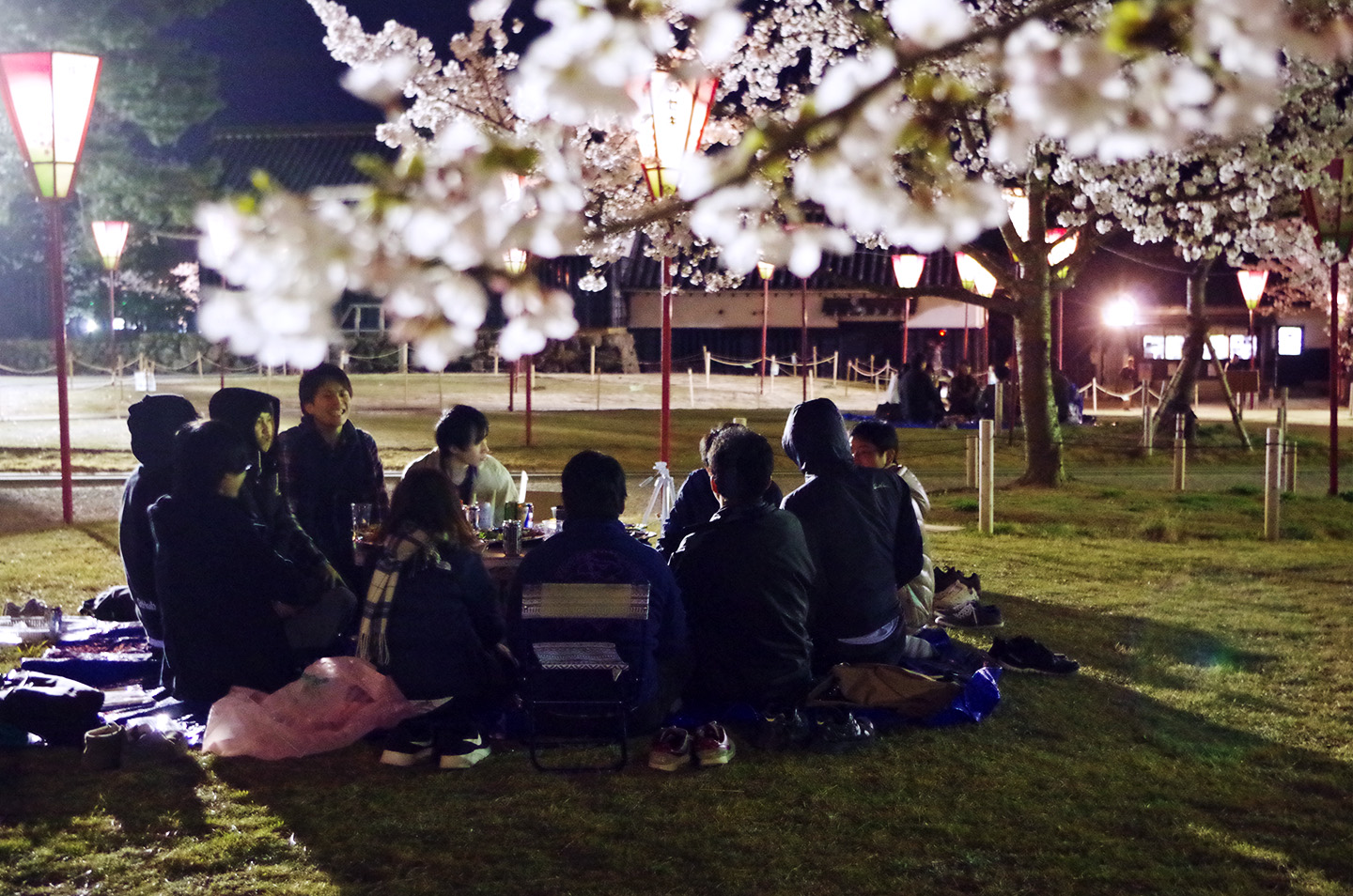 この美しい松江城天守閣のすぐふもとで、ライトアップをされた桜とともにお花見をすることができます。