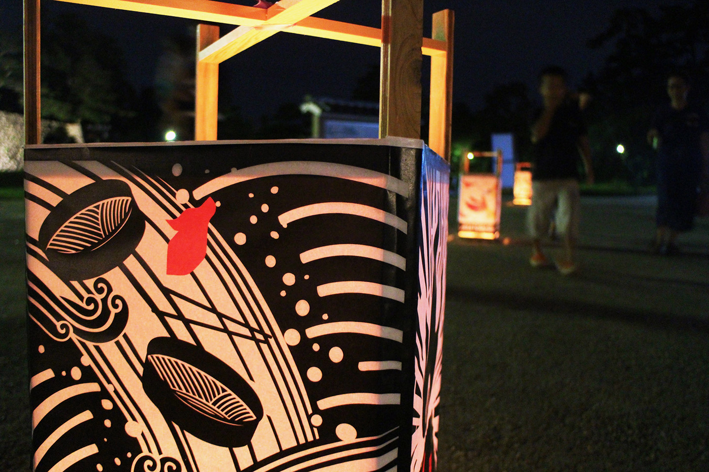 水と光の幻想的な景観が楽める 活かす表現を目指し、行燈の4面すべてに、光を通す部分と遮蔽する部分とのコントラストが映える独自の切り絵を配しました。