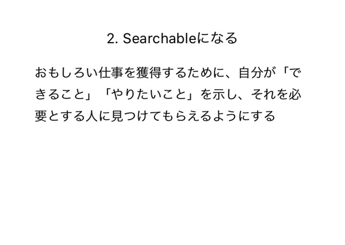 そして、この「Searchable」のセクションからは、発信する内容だけでなくその発信方法を考えることで、自分が持っている価値を最大限に引き出せることを学びました。