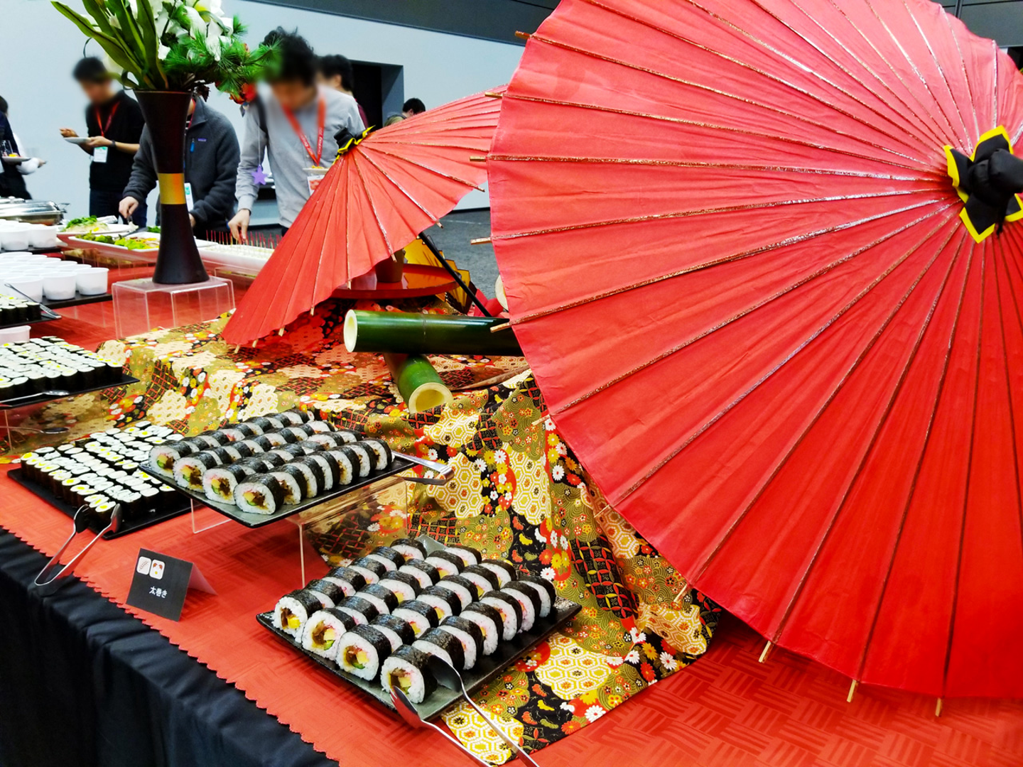参加費用はチケット代に含まれるため、実質無料で参加できるこのパーティ。お寿司職人さんが来たり、スポンサー企業の工夫されたお菓子が並んだりで見てるだけでも楽しい気分になります。もちろんお腹を満たせる量の食事が出るのも良い。