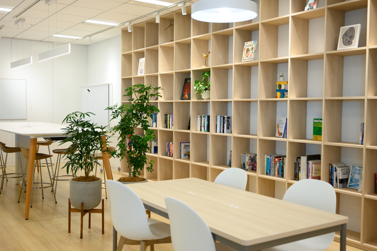 フリーのMTGスペースを増やし、リフレッシュできるソファ席やスタンド席などを設置。壁一面には大きな本棚を設置するなど、コミュニケーションやインスピレーションを生むオフィスとなっています。