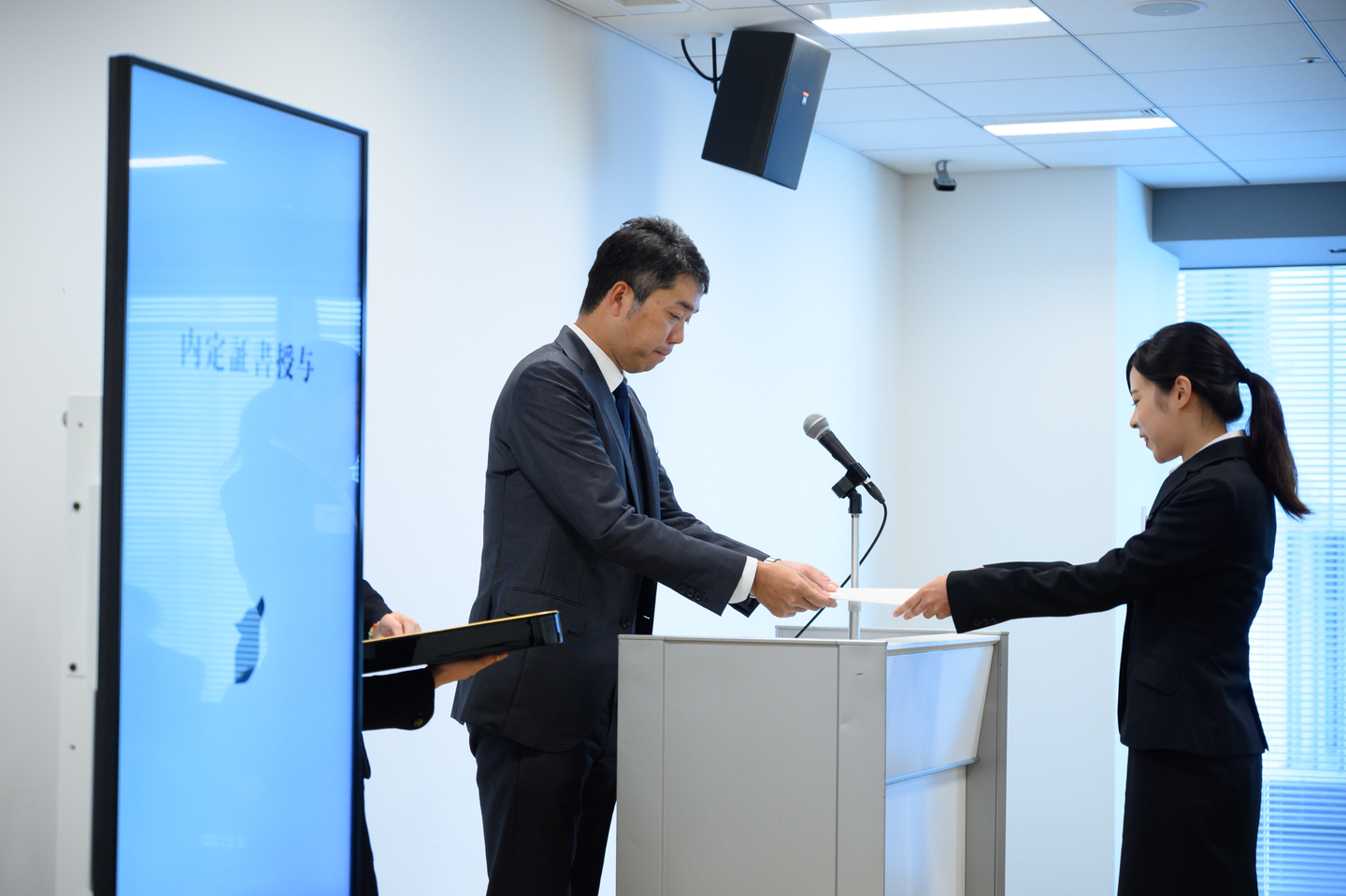 キックオフの際には、一人ひとりの自己紹介も。大勢のスタッフの前で緊張する内定者のみなさんでしたが、社会人になる自分を想像しながら今後チャレンジしたいことなどを話してくれる姿からは、期待感も伝わってきました。
