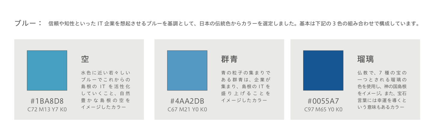 ・色面はIT企業のスピード感、正確さの意味を持つ2つのブルー色(群青、瑠璃)を使用