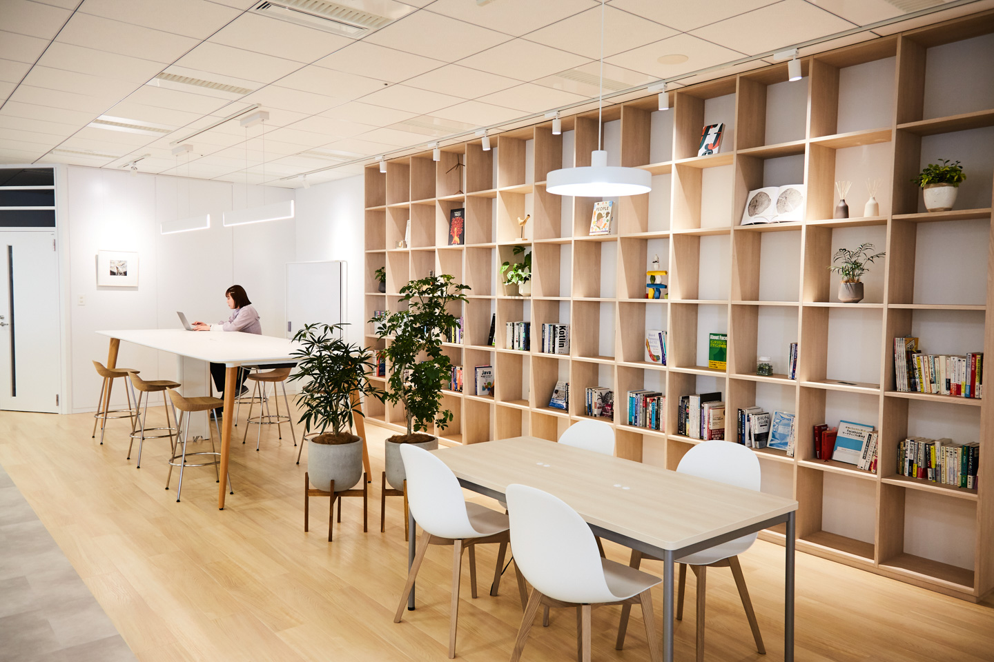 また、色んな場所にグリーンを置くことでリラックスできる空間にもなっており、エンジニアが在籍するフロアには、中央にシンボルツリーを配置。まだ小さなツリーですが、これから伸びていくようなので、成長を見守るのも楽しみです。