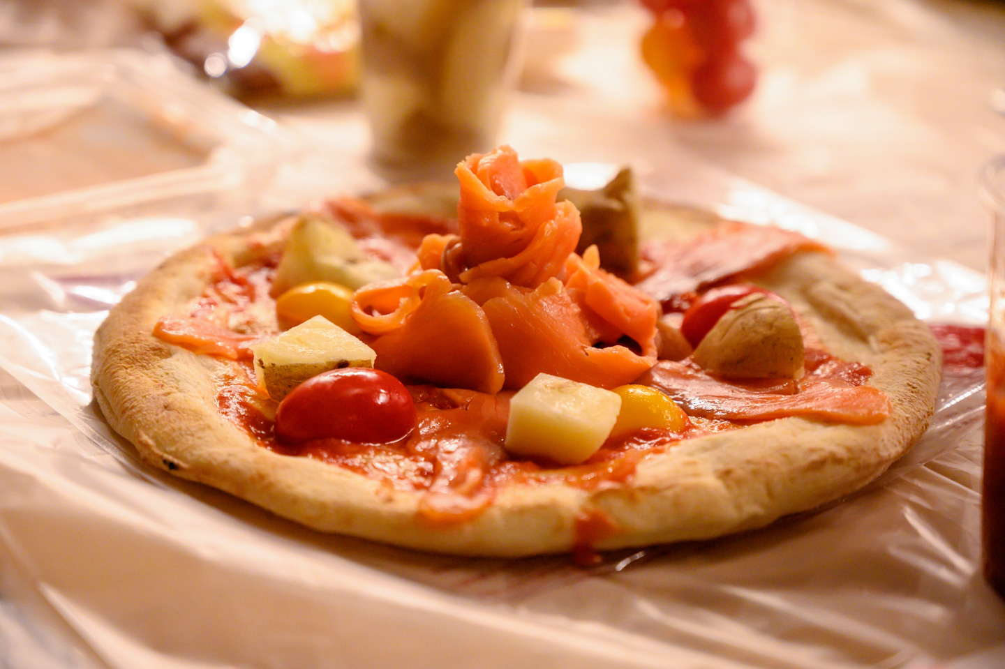 (ピザの出来上がりの写真。薔薇のようにトッピングされたスモークサーモンが乗っています)