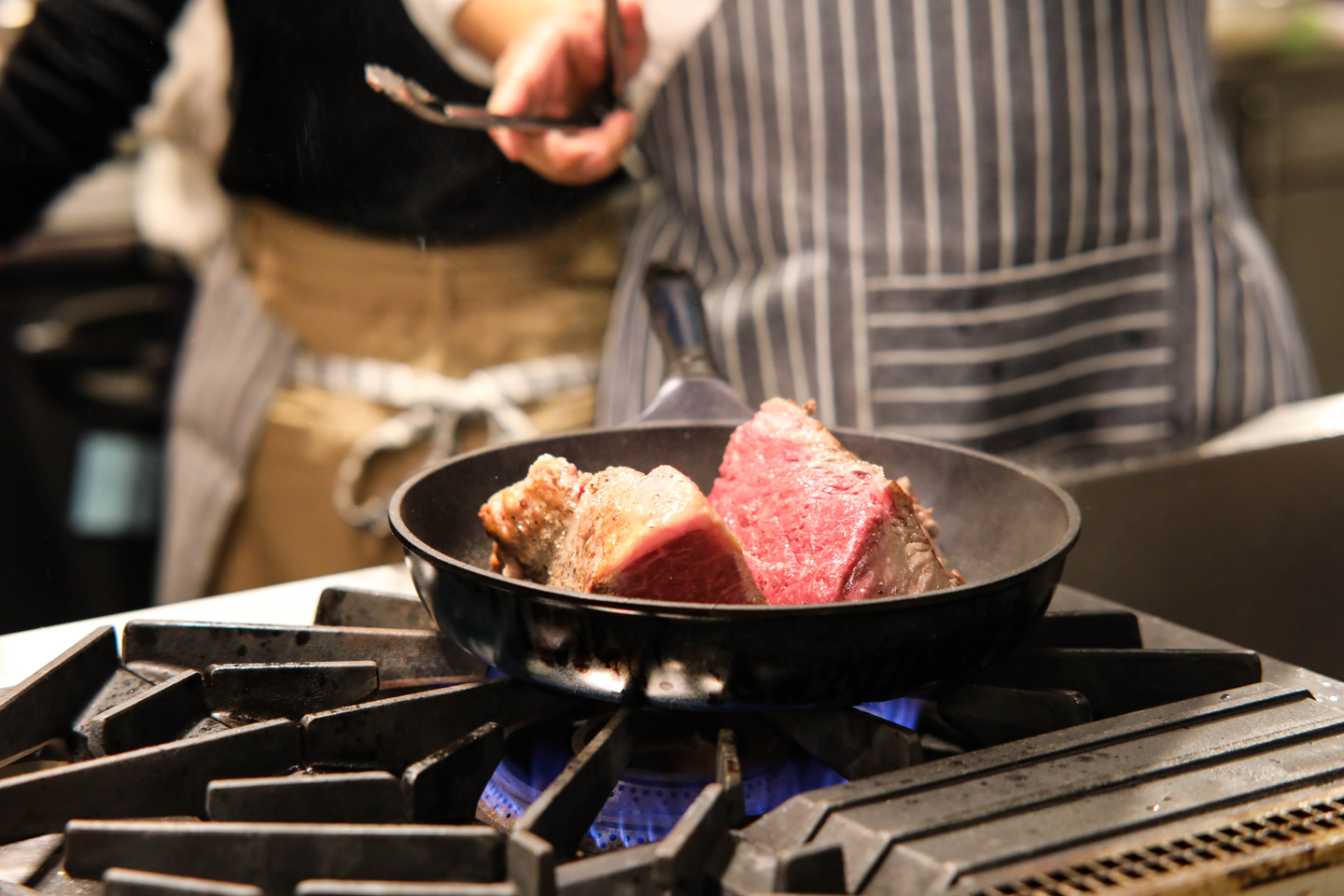 (ローストビーフに焼き目を入れている写真。すでにおいしそう...)