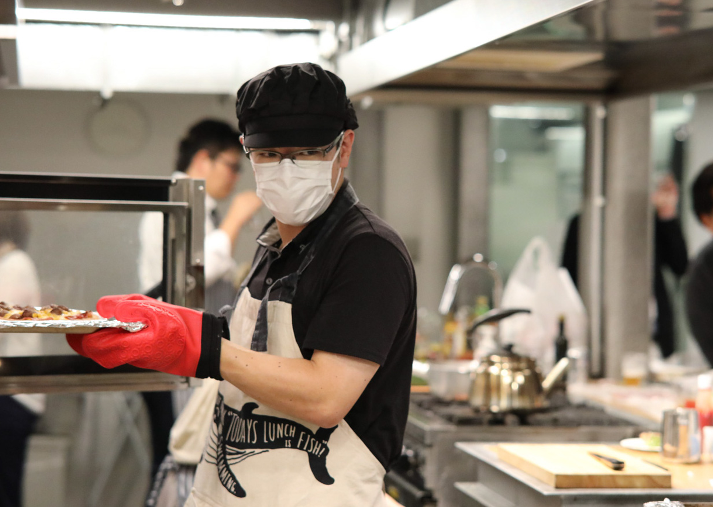 営業、開発、デザイン、品質管理、管理と全部門から有志で集まった腕自慢の調理スタッフたちが、思い思いの調理を行います。