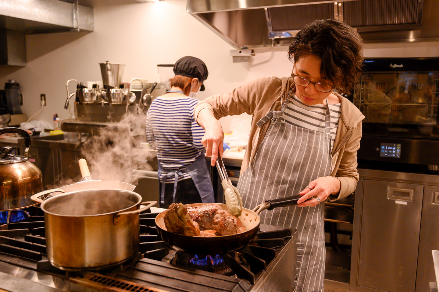 (キッチン内の写真。スタッフが調理の準備を行いながら談笑しています)