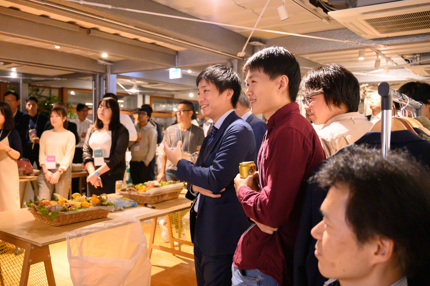 (開会、乾杯挨拶の写真。スタッフがドリンクを手に開始を待っています)