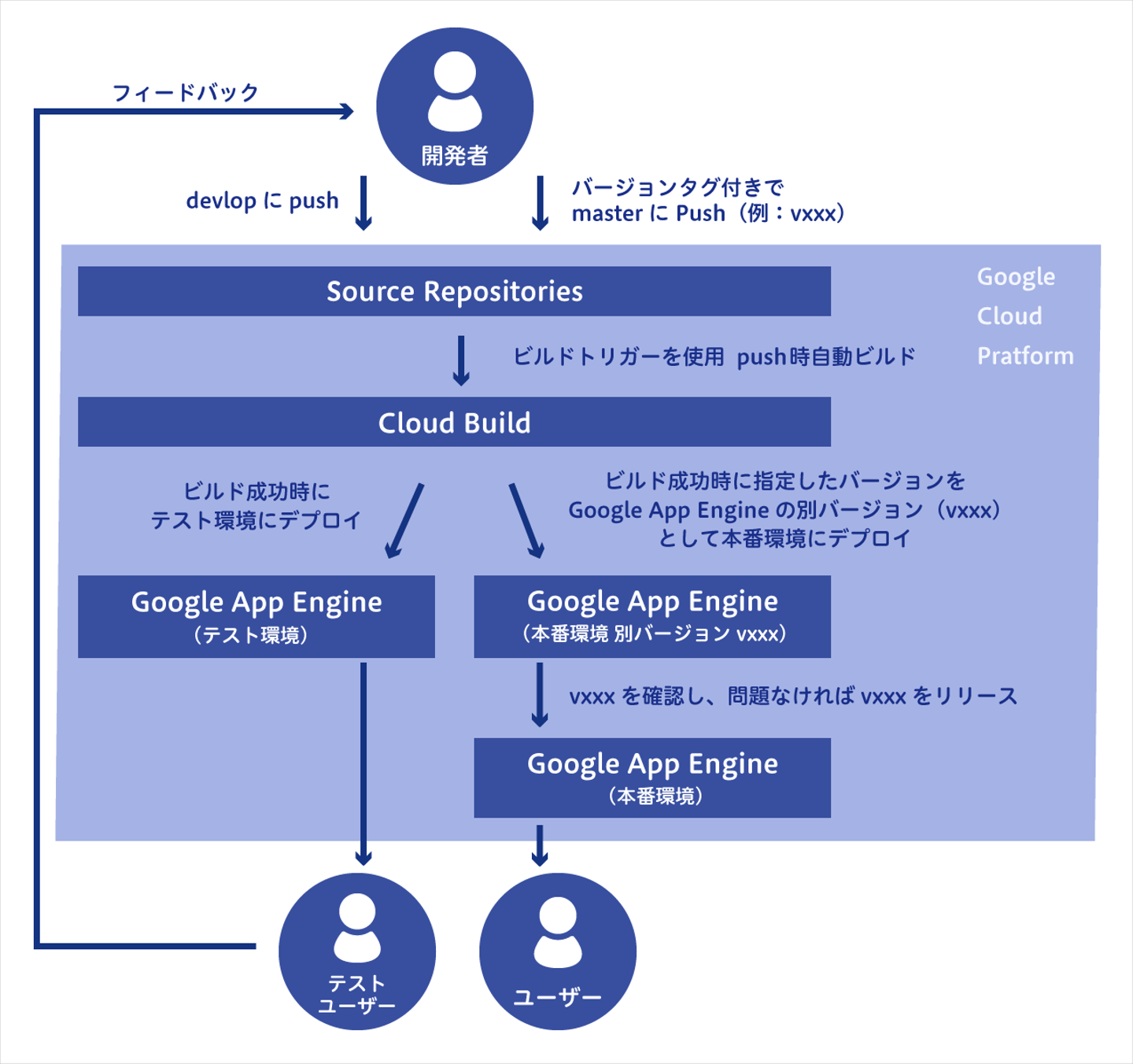 こういった問題を解消するため、同じGCP サービスであるCloud Source RepositoriesとCloud Buildを使用、連携し、以下の図のようにビルドやデプロイなど、全体的なプロセスを自動化しました。
