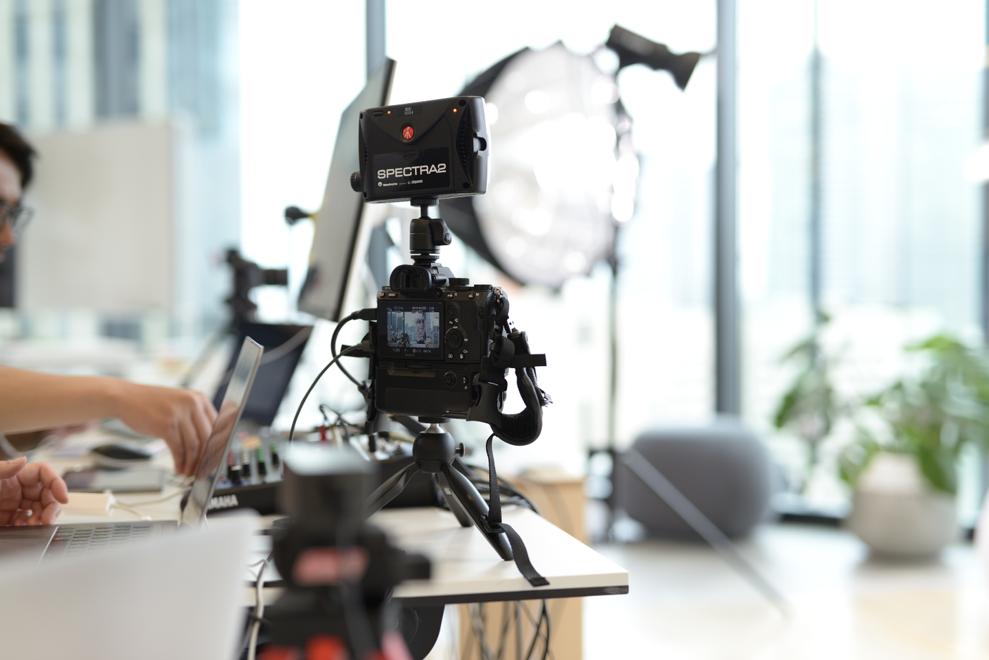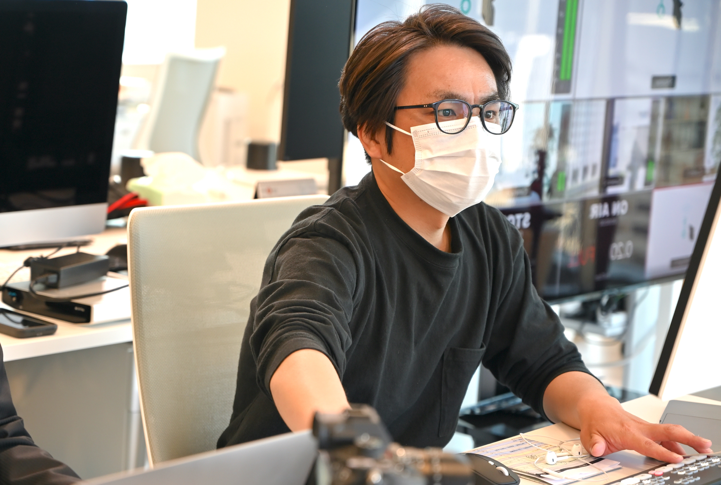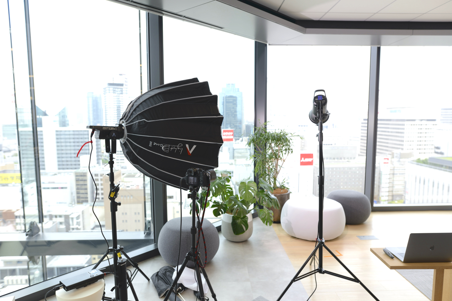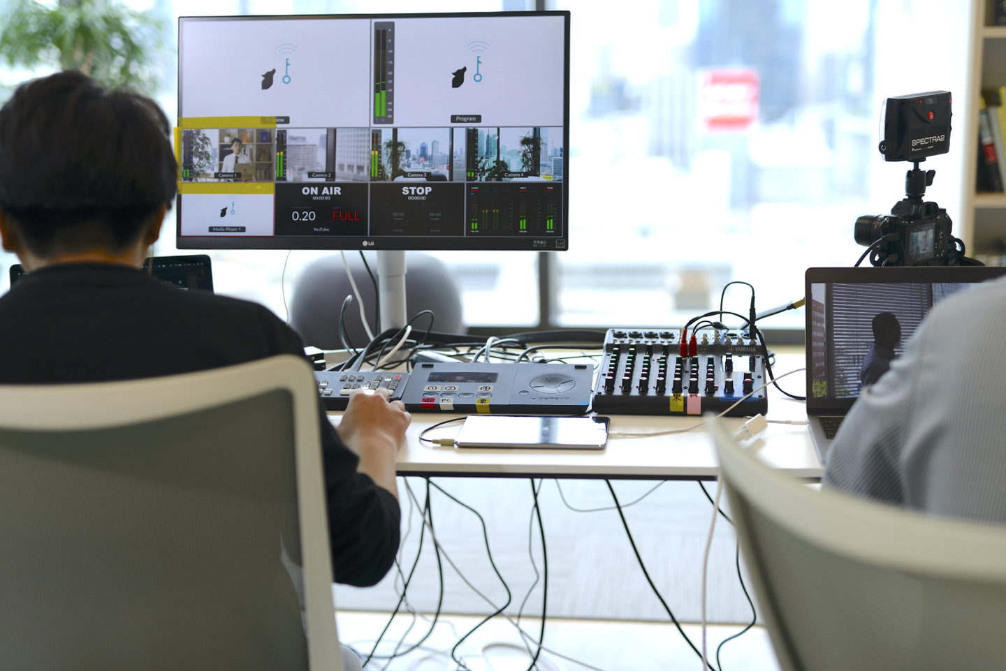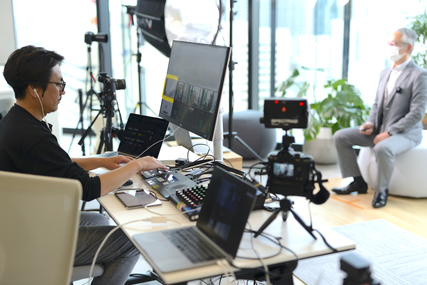 いくつかあるのですが、まず音声について、現場に反響する音声をいかにマイクで拾わないようにするかや、マイクのハンドリング(誰がどの順番で使うか)などを考えなければならず、指向性、設置方法の違ういろんなマイクを試しました。 最終的には登壇者はワイヤレスピンマイクを使うことに落ち着きました。 照明については、大阪本社があるグランフロントからの放送というロケーションを活かすために、街並みを背景にしたかったので窓際にセッティングをしたのですが、やはり日中の逆光に勝てる照明の強度を出すのにも苦労しました。