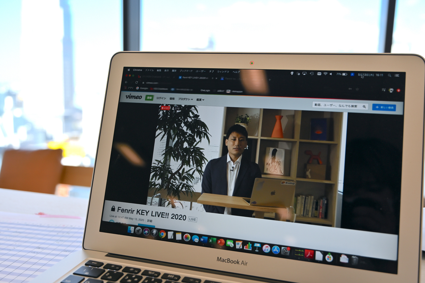 キックオフでは社外秘の情報を発信するので、 「セキュアな配信ができること」ということが前提で、さらに「高画質での配信ができること」を考慮して、 Vimeo で配信することになりました。 まずはツールでの技術条件の確認をして、ATEM Mini Proという映像スイッチャーを用いて送出する画質と配信するビットレートの負荷のシュミレーション、スイッチャーのオペレーション構築をしていきました。その中で、フェンリルが所有する機材一覧から、要件を満すカメラ機材などの選定をしました。 続けて、現場でテストを繰り返しながら放送するロケーションの決定、機材のセッティングリハーサルにて、登壇者とオペレーションの確認を行いました。