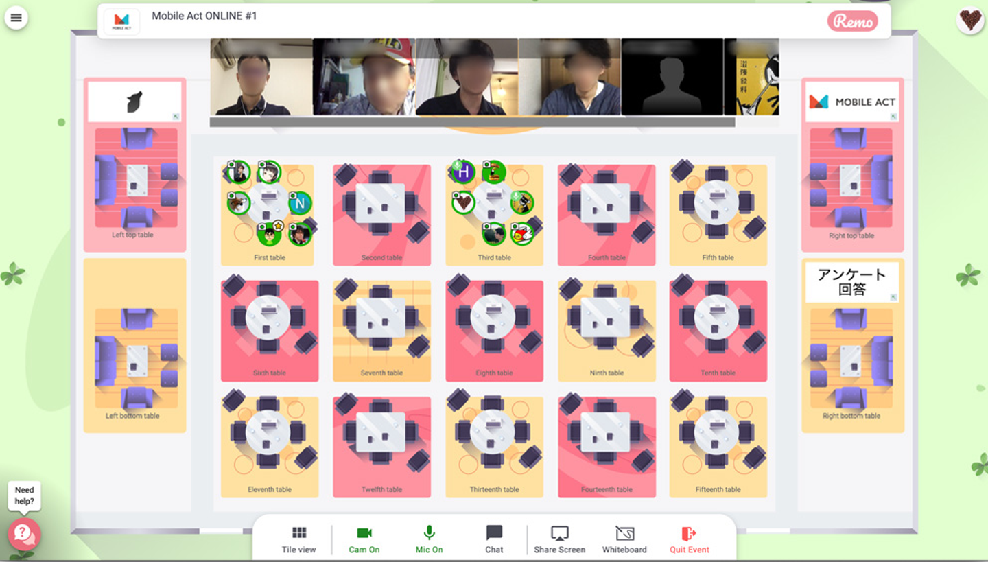 そこで、フェンリルで普段から社内の交流用途で使っている Remo を使うことにしました。ひとつの会場に複数のテーブルがあり、テーブルごとに分かれて対話するため、オフラインの懇親会の雰囲気に近くなります。