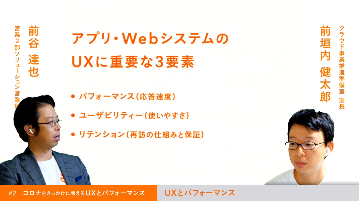 #2のタイトルは「コロナをきっかけに考えるUXとパフォーマンス」。システムのパフォーマンスがアプリやデジタルサービスのUXにどのように影響するかを中心にお話ししました。