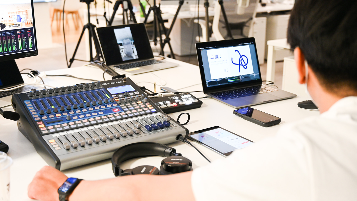 三枚のディスプレイを並べて、それをカメラに収めて配信する手法を採用。リモートワークやテレビ会議が当たり前になる中で、一つの画面を分割するグリッド表示にみんな飽きているのではないかという仮説から着想した配信形式です。
