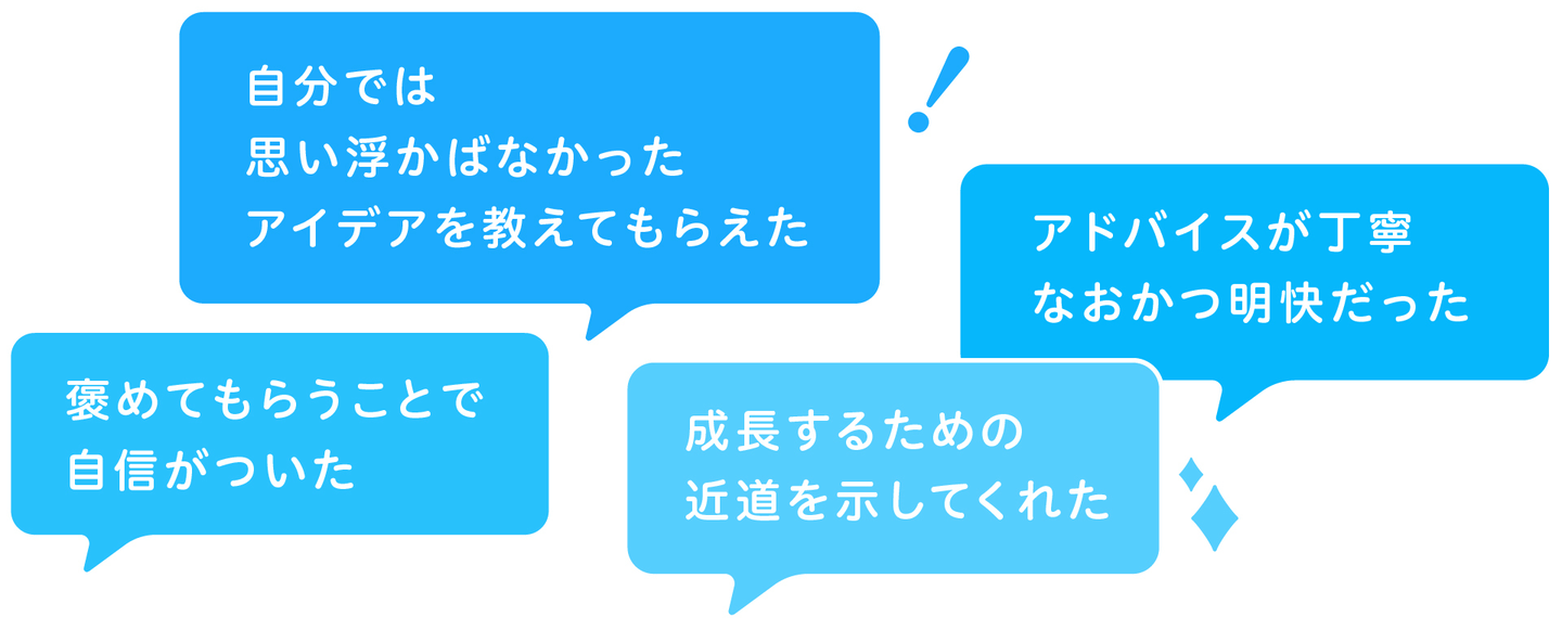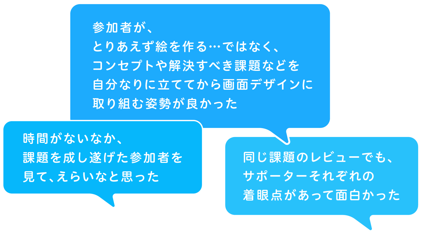 「コンセプトやトンマナに沿ってビジュアルを制作したつもりでも、レビューしてもらうことで、それが表現できてないことを実感した」「成長するには何をすべきなのかレビュワーがわかりやすく教えてくれる」など、レビュワーのFBによって足りない部分に気づくことができた参加者がたくさんいました。