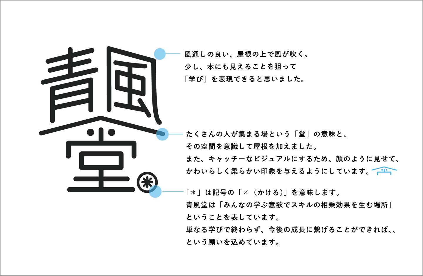 そんなコンセプトを「青風堂」の文字で表現したロゴもつくられました。屋根の上に吹く風や、楽しい学び屋を思わせる柔らかな“顔”がデザインされたロゴは、このプロジェクトの雰囲気がうまく表現されています。