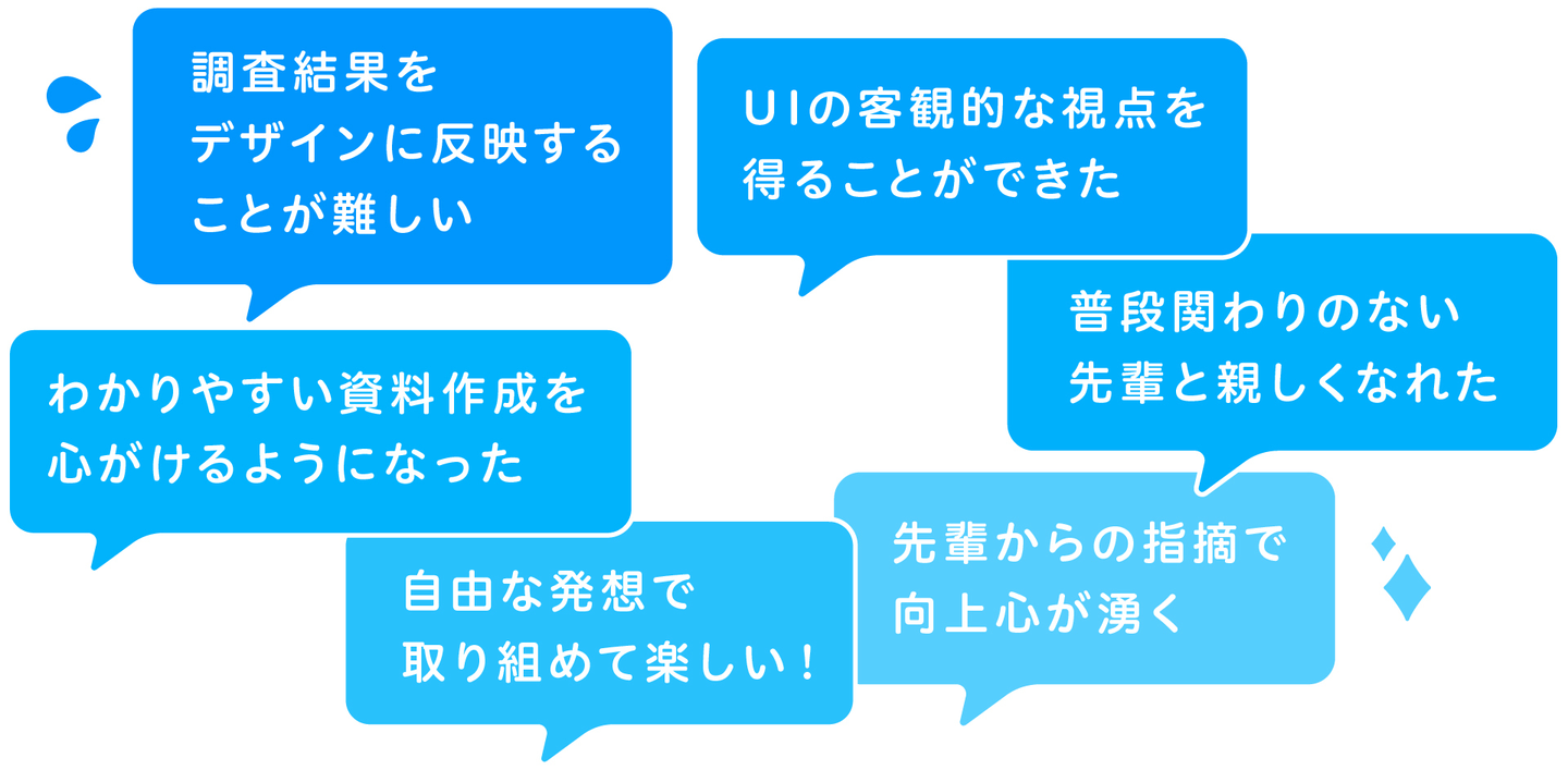 通常の業務ではユーザーフローからUIに至るまでの経験がない若手メンバーにとって、アイディアを広げて発想力を鍛えたり、先輩方から細かなフィードバックを得られることは、とても貴重な経験になっているようです。