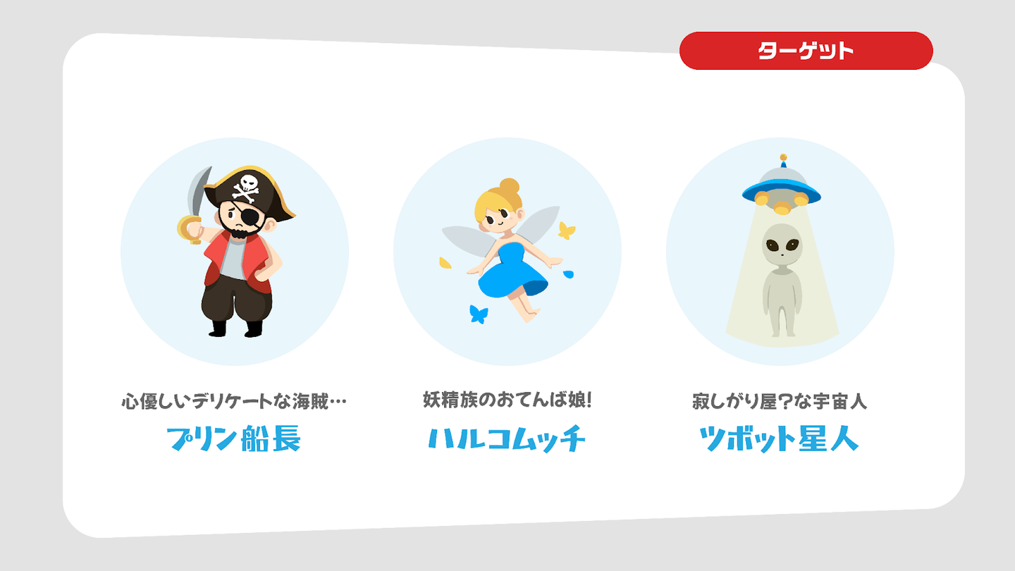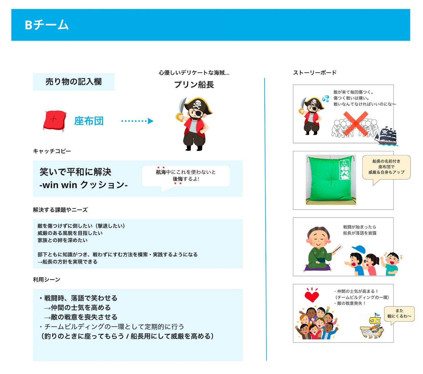 そして後半の「売ってみせます!ひらめきテレビショッピング」では、「海賊」「妖精」「宇宙人」といった奇想天外なターゲットに向けて商品を訴求するアイデアワークショップを開催しました!各チームには3人のうちいずれか1人のターゲットが指定され、輪ゴムやうちわといった日用品10点の中から好きなものを1つ選んでテレビショッピング形式でプレゼン!