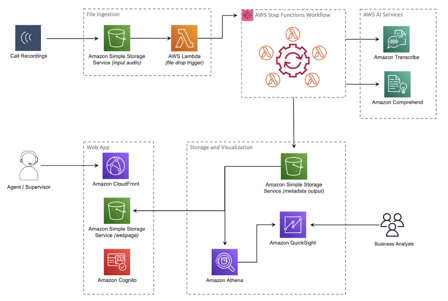 通話後分析では、コールセンターでの顧客との会話を録音した音声データをTranscribe・Comprehendを用いて分析し、顧客の感情やスタッフの対応の結果などの情報を取得します。