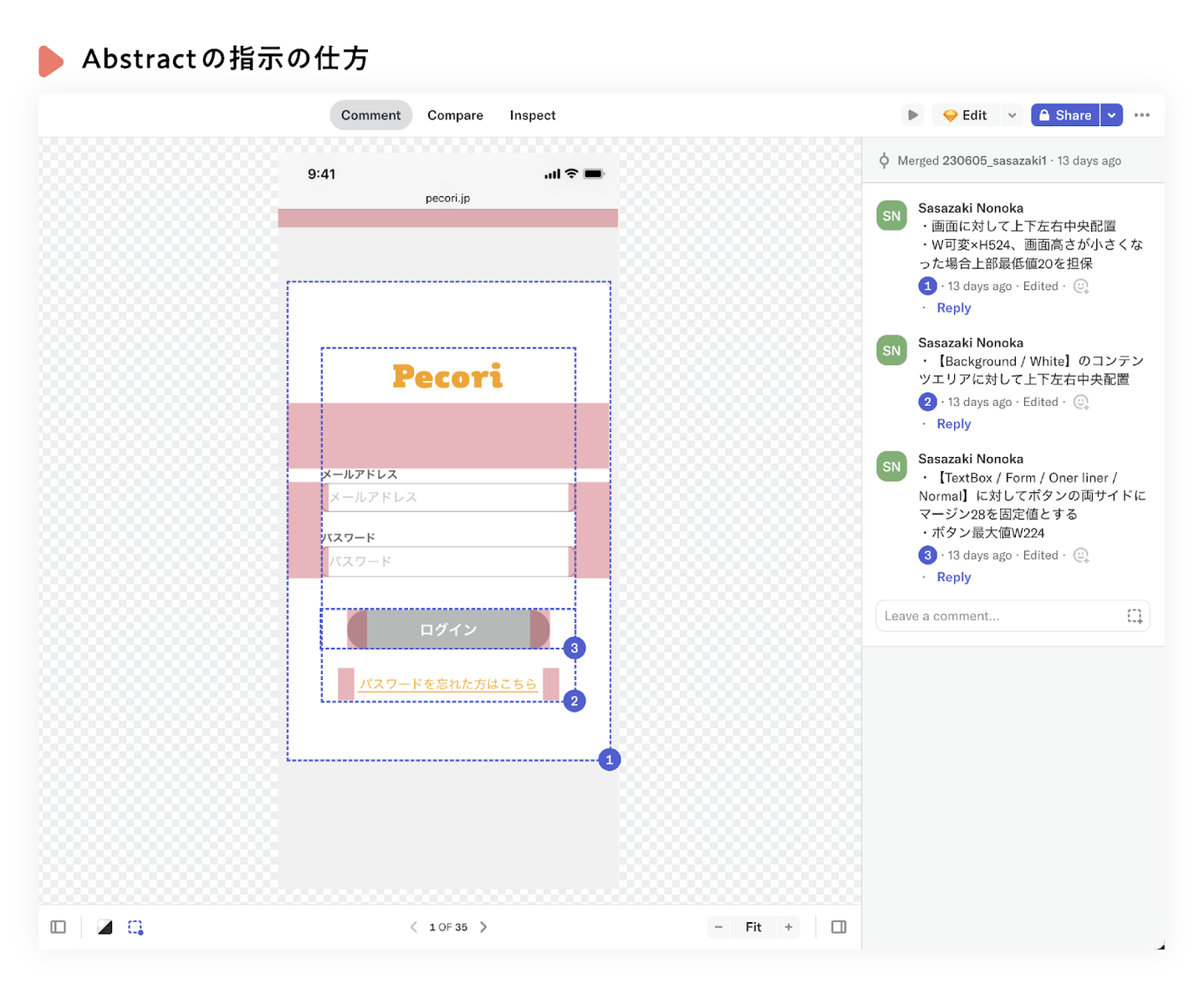 まず、Sketchでボタンの種類や状態変化など全ページに共通して入る要素を「共通パーツ」とし、テンプレートごとに変更する共通の指示を作成します。次に、Abstractのコメント機能を使用して指示を記載します。どこに対してどのパーツが配置されるのかなど、完成見本のデザインだけでは分かりにくい部分を指示し、エンジニアと認識を合わせます。
