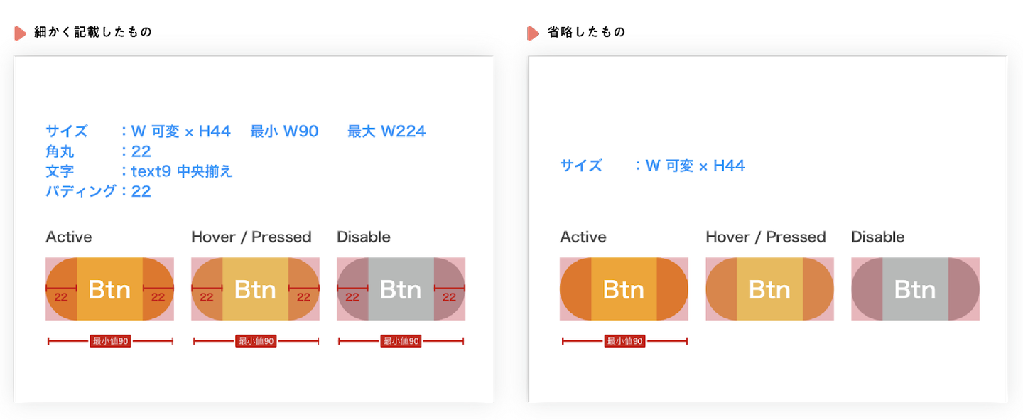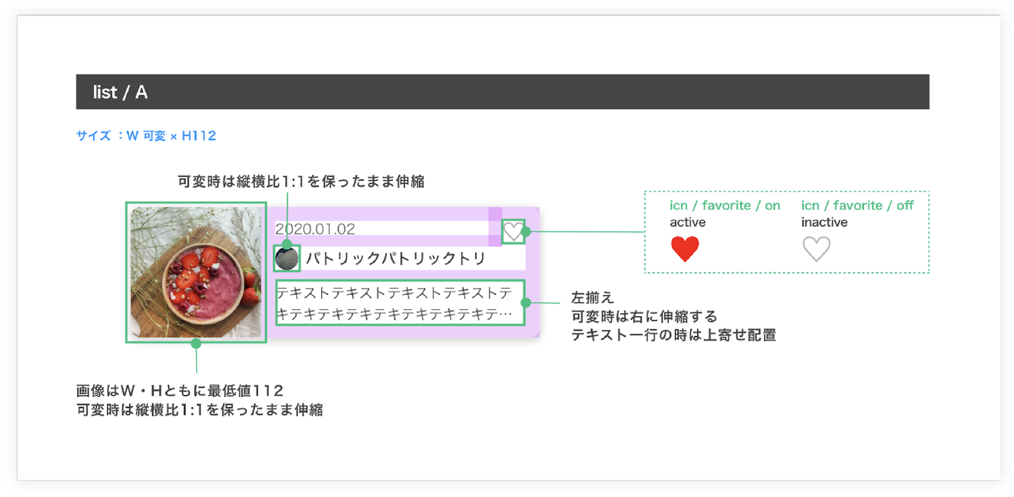 要素の位置や画面サイズの変化の仕方、スクロール時の挙動やボタンタップ時の変化などを記載します。