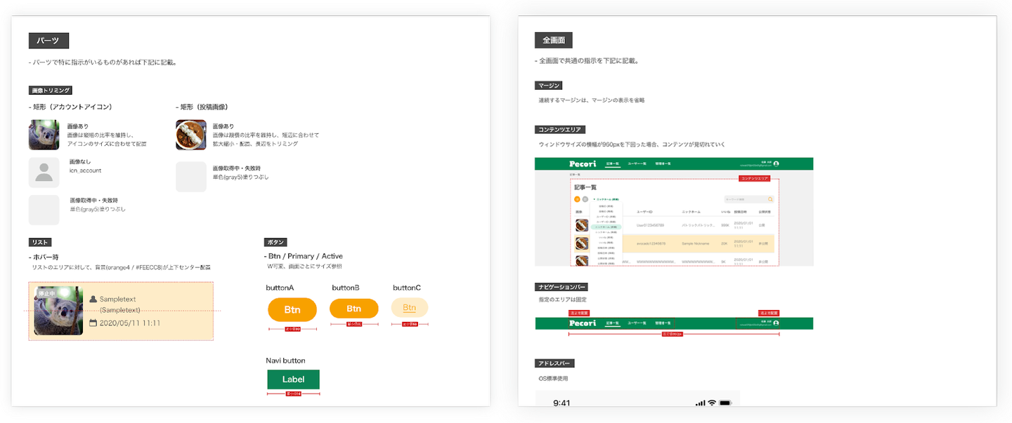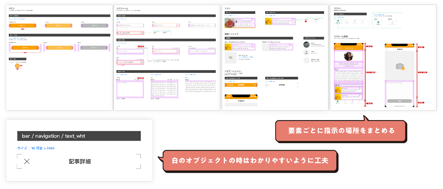 詳細を読まなくても見ただけで伝わるように、指示を伝えたい人のことを考慮する必要があります。要素ごとに場所をまとめたり、白のオブジェクトのときはどの要素に対しての指示なのかが明確になるように工夫したりと、デザイナーの意図を分かりやすく正確に伝えるための工夫や配慮が大切だと感じました。