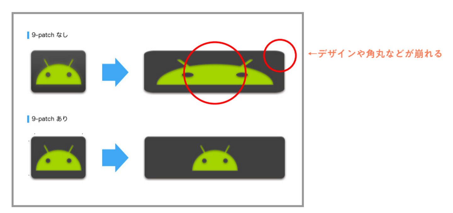 「9-patchを使用した方がいい箇所」と「9-patchを使用するのに向いてない箇所」を素早く判断できるよう、特性をよく理解しておくべきだと思います。