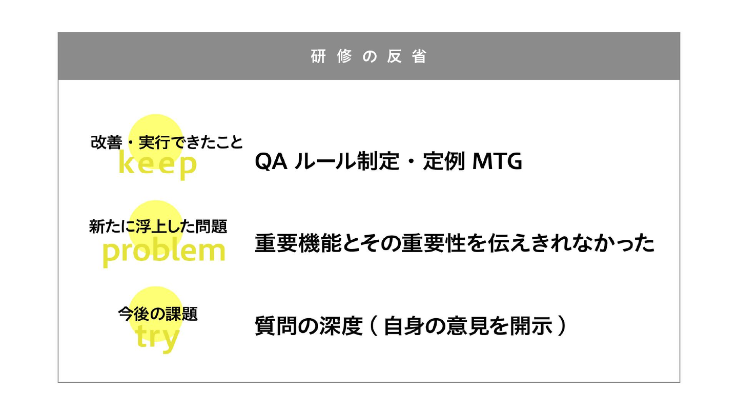 仕事としてのコミュニケーションの重要性、QAとして疑いや疑問を持つ着眼点、仕様ミスなどにいち早く気付いてアクションを起こすなど、基本的なことがいかに重要であるかを研修を通して学んでもらえました。