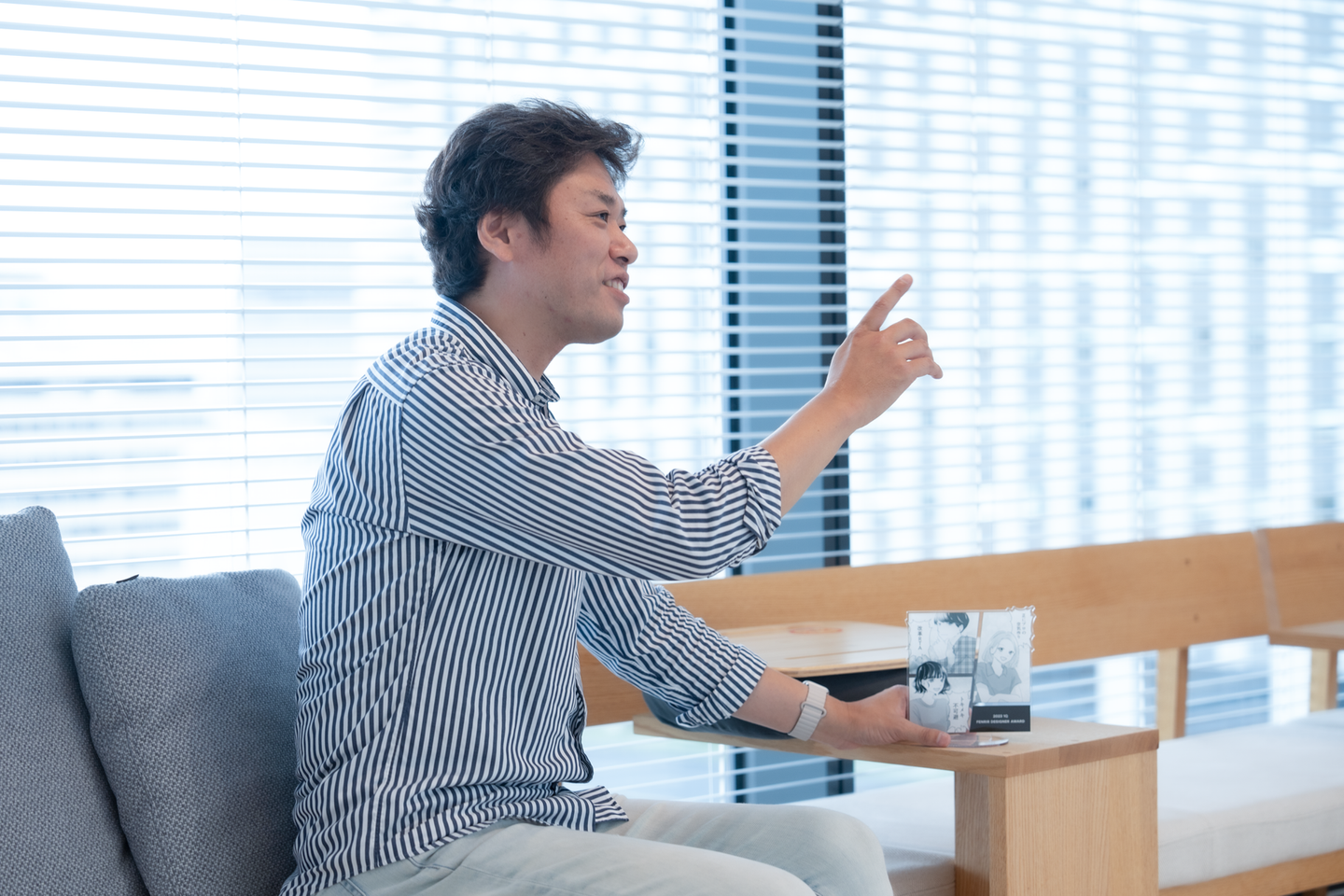 「アクリルスタンドであれば、オブジェのようなイメージで部屋に飾りやすいのではないか」「アクリルスタンドに受賞者の似顔絵を入れて、寄せられたコメントを吹き出しで盛り込むと、もらう側はうれしいのではないか」と創意工夫をしました。
