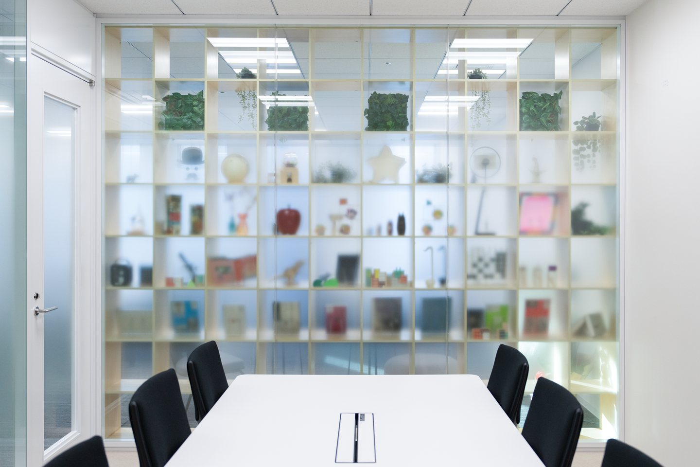 先ほどご紹介した会議室の壁には、曇りガラスの施工型パーテーションを採用しました。会議室に入ると本棚の背面が壁一面に透けて見えるので、来客の皆さんにオフィスのぬくもりや雰囲気を感じ取っていただけます。