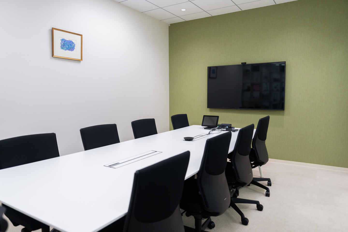 オフィスのエントランスと応接室を兼ねた会議室に、それぞれ絵画を飾りました。この絵画はフェンリルのデザイナーが描いたものです。来客の皆さんがフェンリルのアートに触れ、少しでも「デザインと技術のフェンリル」を感じ取っていただきたいと、目に入りやすい場所に掛けました。