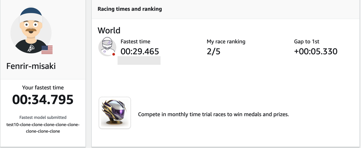 決勝の結果、5人中2位になることができ、DeepRacerの経験が浅くても上位に入れたのでうれしかったです。