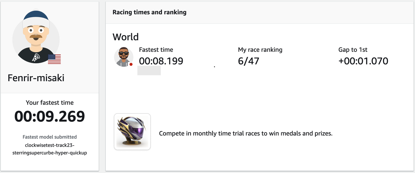 今後は、DeepRacerの世界大会であるAWS DeepRacer Championship Cupへの出場を目指したいです。そのためにはまず、月次で開催される大会で上位に入賞することが必要です。まずはそこから始めたいと思います。