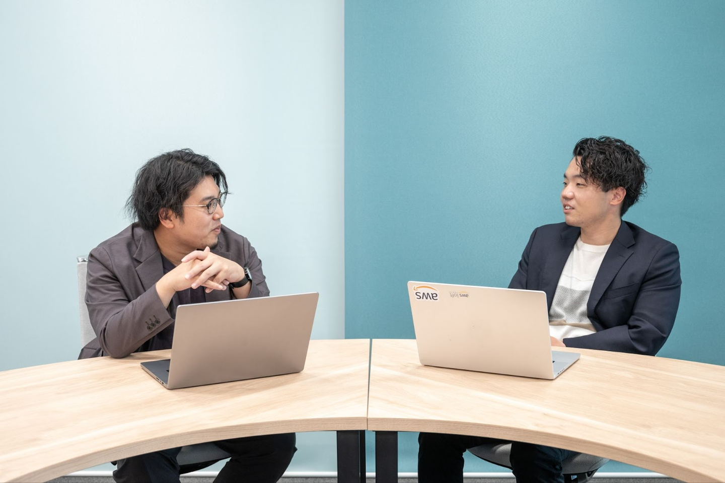 クラウドネイティブ技術部の三﨑と、4月に新設された北米事業部の宮﨑。同時期に入社し、それぞれの部署で活躍する2人に、現在の取り組みや将来の目標について語ってもらいました。