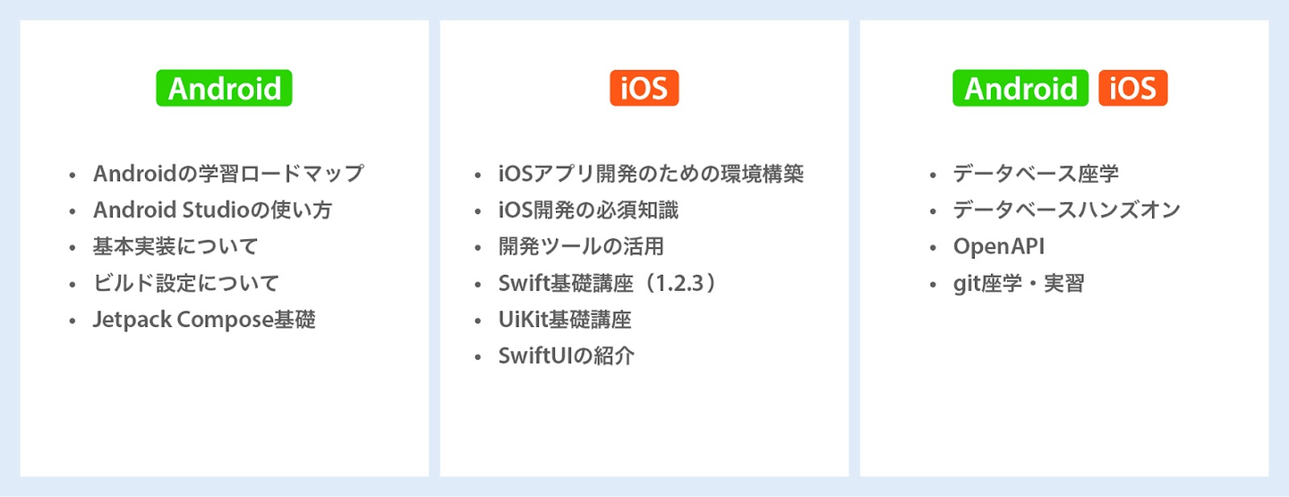 アプリエンジニアの研修では、Android/iOSエンジニア共通の知識や、各OSの専門的な知識を学んでもらいました。