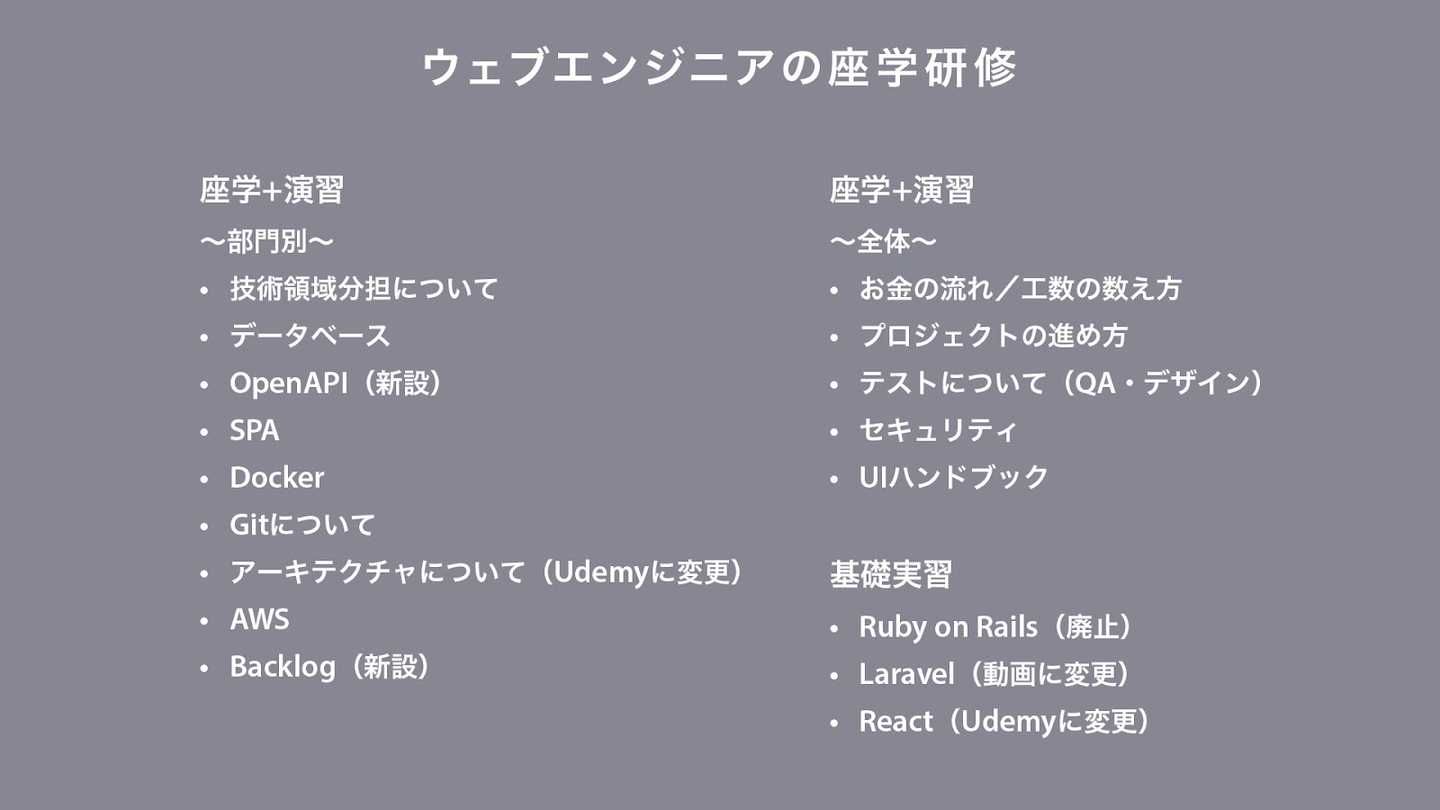 ウェブエンジニアの研修では、実習や業務で扱うLaravelやReactなどの技術を学んでもらいます。フェンリルで活用する技術や手法は、時流とともに変化するため、それに合わせて座学の内容もアップデートしています。今年度はフェンリルで活用しているBacklogとOpenAPIの座学を新設し、その他の座学の内容も最新のものに更新しました。