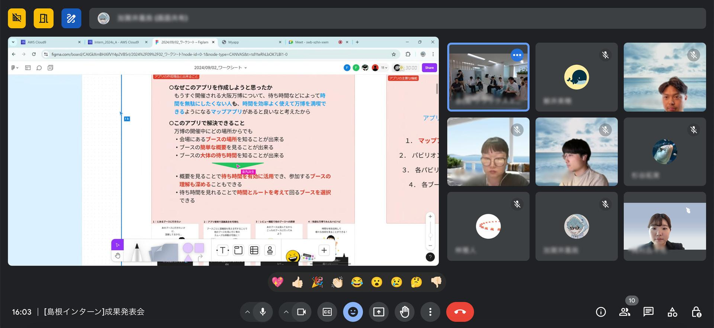インターンシップ参加者と島根支社にいるメンバーだけでなく、フェンリルの他拠点にいるメンバーもオンラインで参加し、発表に対するアドバイスや質問をしました。