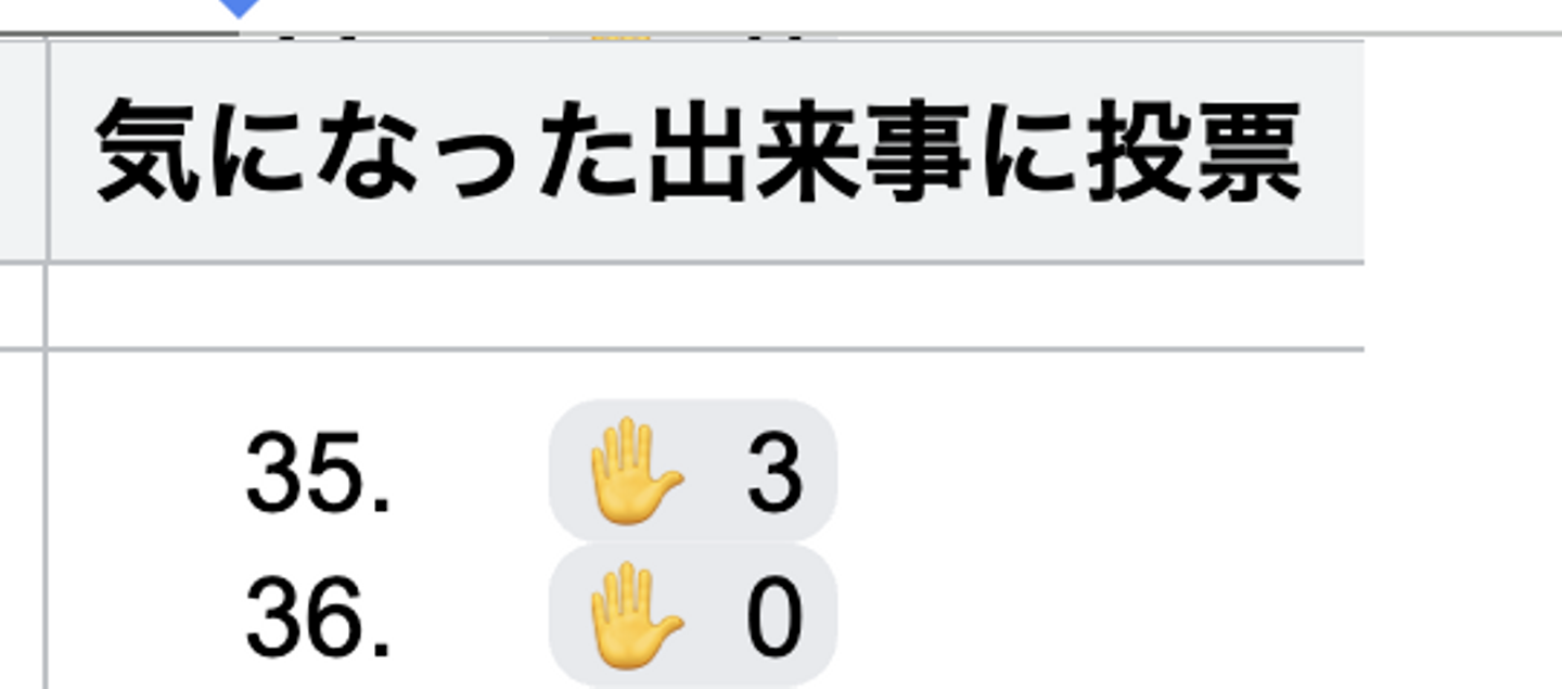 Googleドキュメントの投票チップ機能を使ってみました。誰が投票したかもチップの上にポインタを置いたら表示されます。
