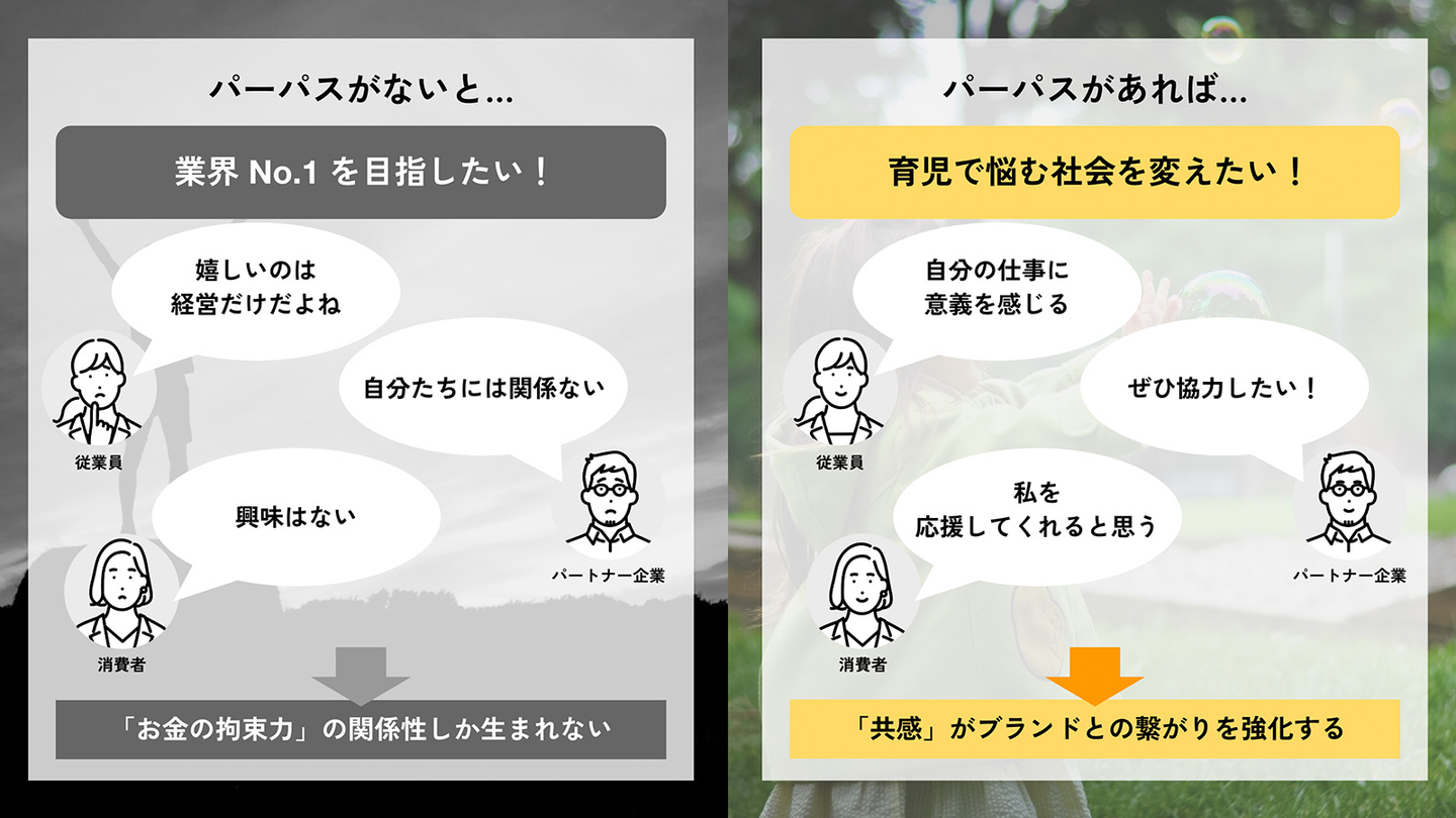 パーパスとは、「社会的大義(ブランドが社会と共有する意味や目的)」であることに対し、ビジョンは「目指したい理想の姿」です。どちらも短期的に変化することのない、覚悟を持った決意が必要です。パーパスは、何のために存在するのかという目的であり信念であるからこそ、その企業やブランドが向き合う誠実な姿が多くの共感を生み、求心力に繋がると考えます。